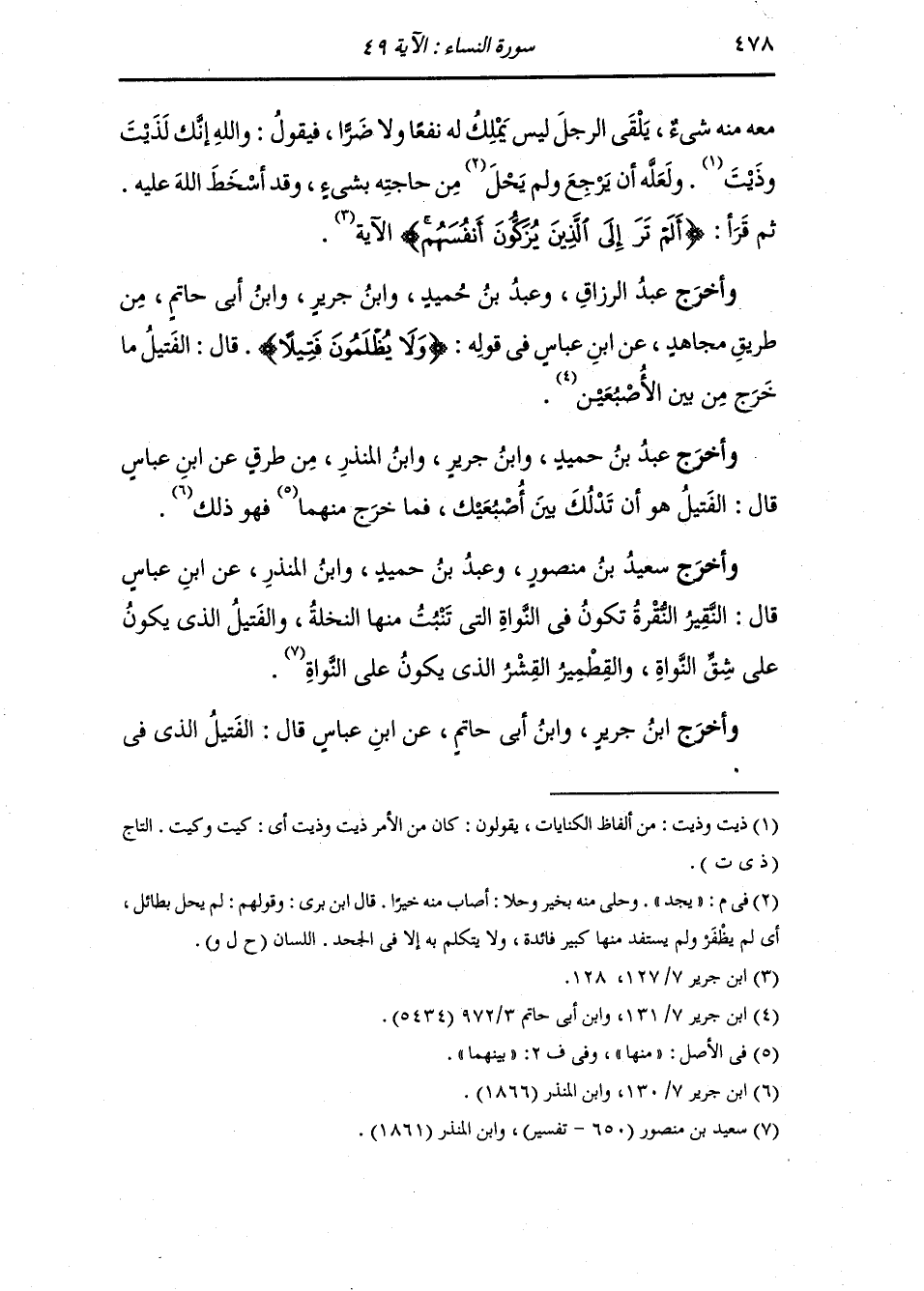 وأخرج الطستي ، وَابن الأنباري في الوقف والإبتداء عن ابن عباس أن نافع بن الأزرق قال له : أخبرني عن قوله عز وجل {ولا يظلمون فتيلا} قال : لا ينقصون من الخير والشر مثل الفتيل هو الذي يكون في شق النواة ، قال : وهل تعرف العرب ذلك قال : نعم ، أما سمعت نابغة بني ذبيان يقول : يجمع الجيش ذا الألوف ويغزو * ثم لا يرزأ الأعادي فتيلا وقال الأول أيضا : أعاذل بعض لومك لا تلحي * فإن اللوم لا يغني فتيلا.