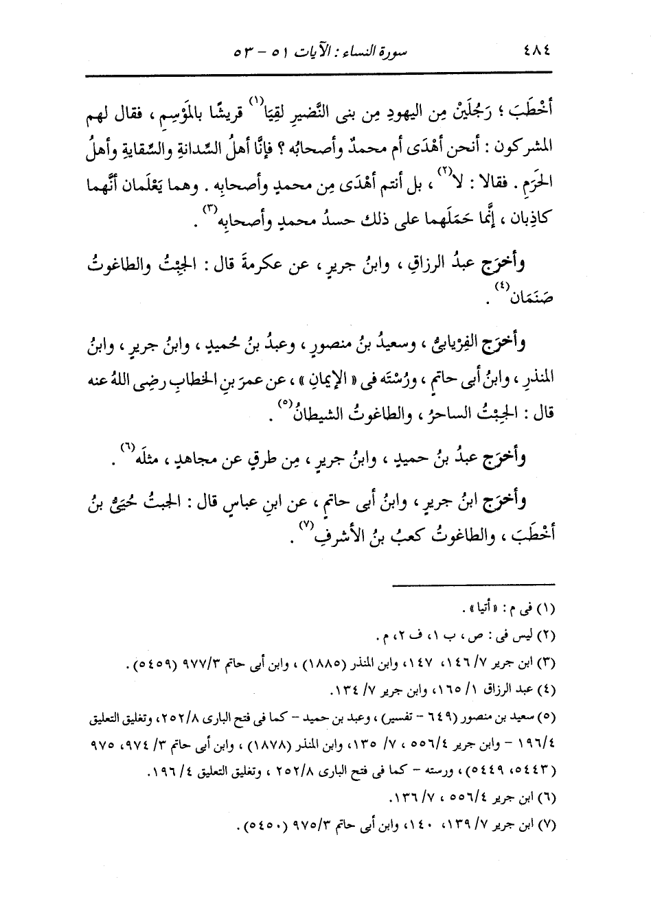 وأخرج ابن جرير ، وَابن أبي حاتم عن ابن عباس قال : الجبت الأصنام والطاغوت الذي يكون بين يدي الأصنام يعبرون عنها الكذب ليضلوا الناس.