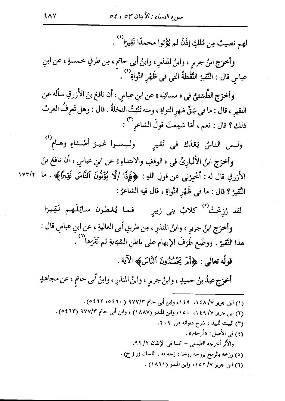 وأخرج عَبد بن حُمَيد ، وَابن جَرِير ، وَابن المنذر ، وَابن أبي حاتم عن عكرمة في قوله {أم يحسدون الناس} قال : الناس في هذا الموضع النَّبِيّ صلى الله عليه وسلم خاصة ، واخرج ابن جرير عن مجاهد {أم يحسدون الناس} قال :