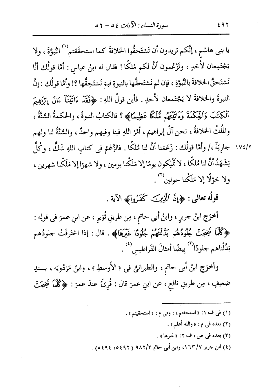 وأخرج ابن مردويه وأبو نعيم في الحلية عن ابن عمر قال : تلا رجل عند عمر {كلما نضجت جلودهم بدلناهم جلودا غيرها} فقال كعب عندي تفسير هذه الآية قرأتها قبل الإسلام ، فقال : هاتها يا كعب فإن جئت بها كما سمعت من رسول الله صلى الله عليه وسلم صدقناك ، قال : إني قرأتها قبل الإسلام {كلما نضجت جلودهم بدلناهم جلودا غيرها} في الساعة الواحدة عشرين ومائة مرة ، فقال عمر : هكذا سمعت من رسول الله صلى الله عليه وسلم.