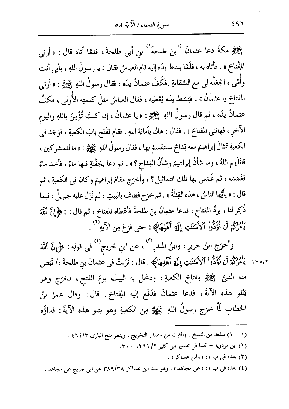 وأخرج الطبراني عن ابن عباس قال : قال رسول الله صلى الله عليه وسلم : خذوها يا بني طلحة خالدة تالدة لا ينزعها منكم إلا ظالم ، يعني حجابة الكعبة.