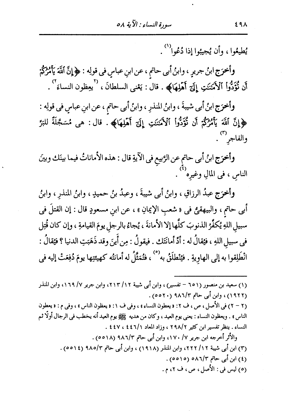 وأخرج ابن جرير من طريق العوفي عن ابن عباس في قوله {إن الله يأمركم أن تؤدوا الأمانات إلى أهلها} قال : إنه لم يرخص لموسر ولا لمعسر.