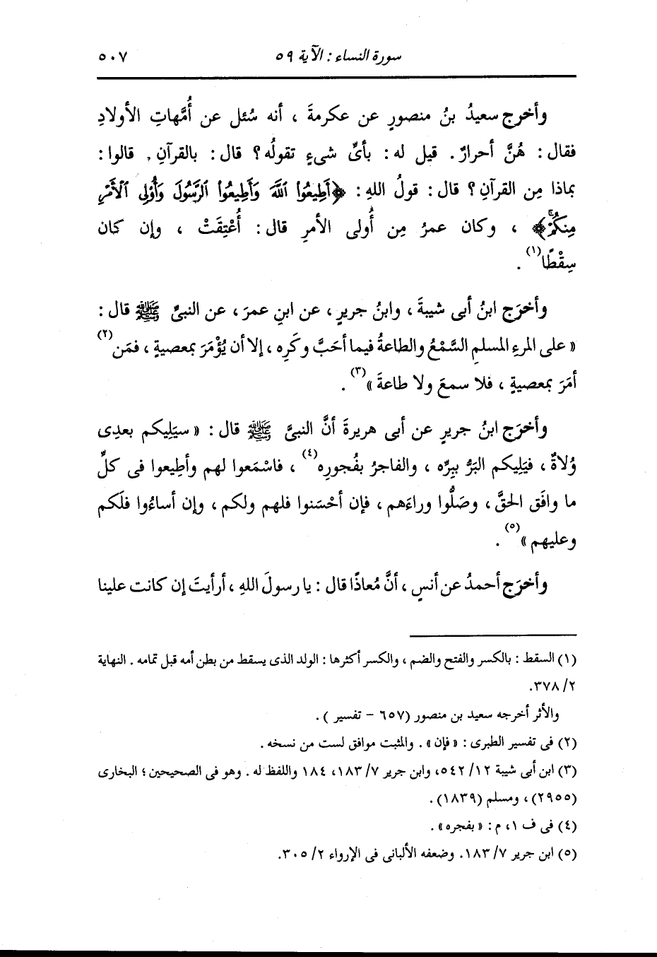 وأخرج ابن أبي شيبة وأحمد وأبو يعلى ، وَابن خزيمة ، وَابن حبان والحاكم عن أبي سعيد الخدري قال : بعث رسول الله صلى الله عليه وسلم علقمة بن بجزر على بعث أنا فيهم فلما كنا ببعض الطرق أذن لطائفة من الجيش وأمر عليهم عبد الله بن حذافة بن قيس السهمي - وكان من أصحاب بدر وكان به دعابة - فنزلنا ببعض الطريق وأوقد القوم نارا ليصنعوا عليها صنيعا لهم فقال لهم : أليس لي عليكم السمع والطاعة قالوا : بلى ، قال : فما أنا آمركم بشيء إلا صنعتموه قالوا : بلى ، قال : أعزم بحقي وطاعتي لما تواثبتم في هذه النار ، فقام ناس فتحجزوا حتى إذا ظن أنهم واثبون قال : احبسوا أنفسكم إنما كنت أضحك معهم فذكروا ذلك لرسول الله صلى الله عليه وسلم بعد أن قدموا فقال رسول الله صلى الله عليه وسلم : من أمركم بمعصية فلا تطيعوه.