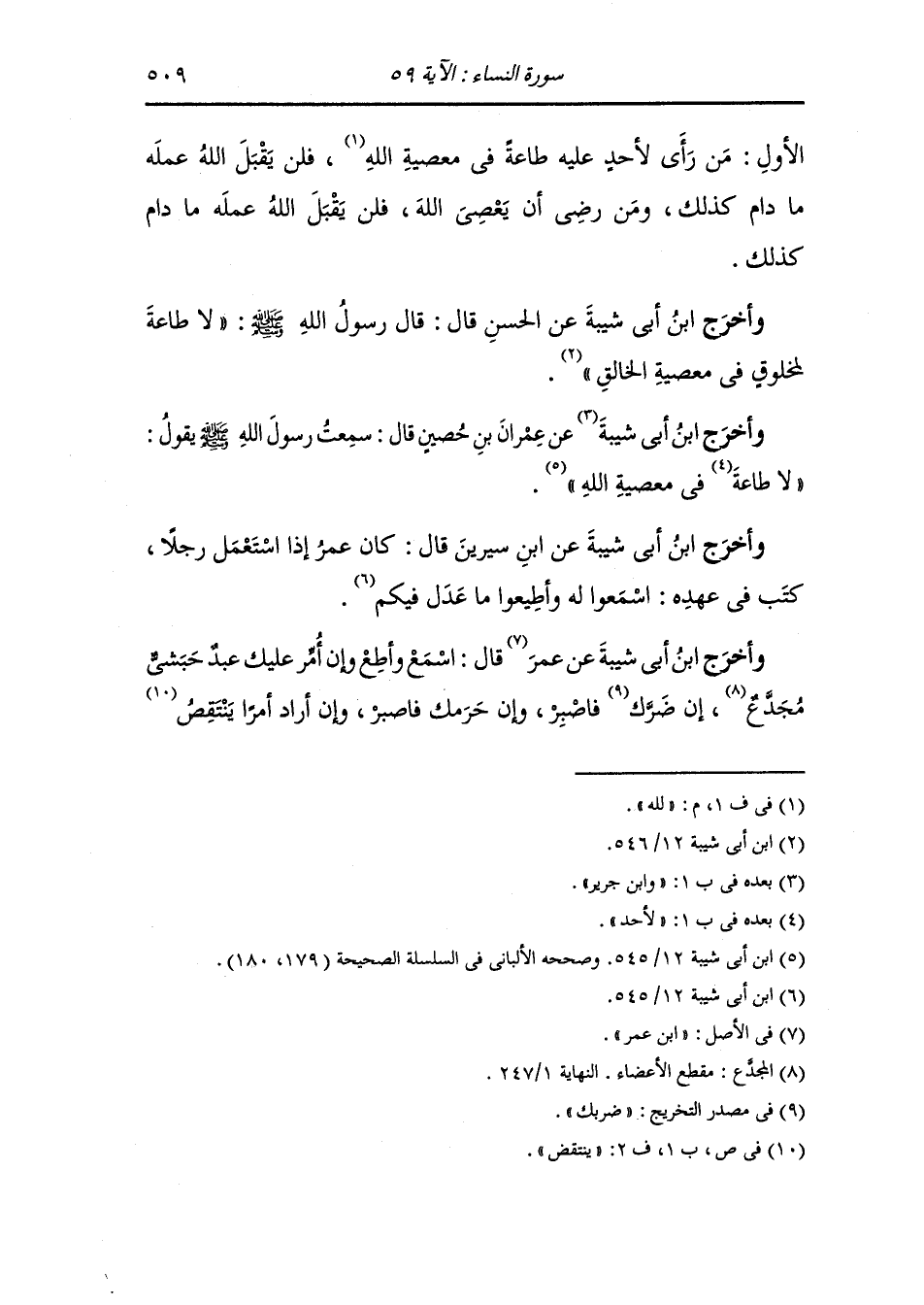 وأخرج ابن أبي شيبة عن عبد الله بن مسعود قال : لا طاعة لبشر في معصية الله.