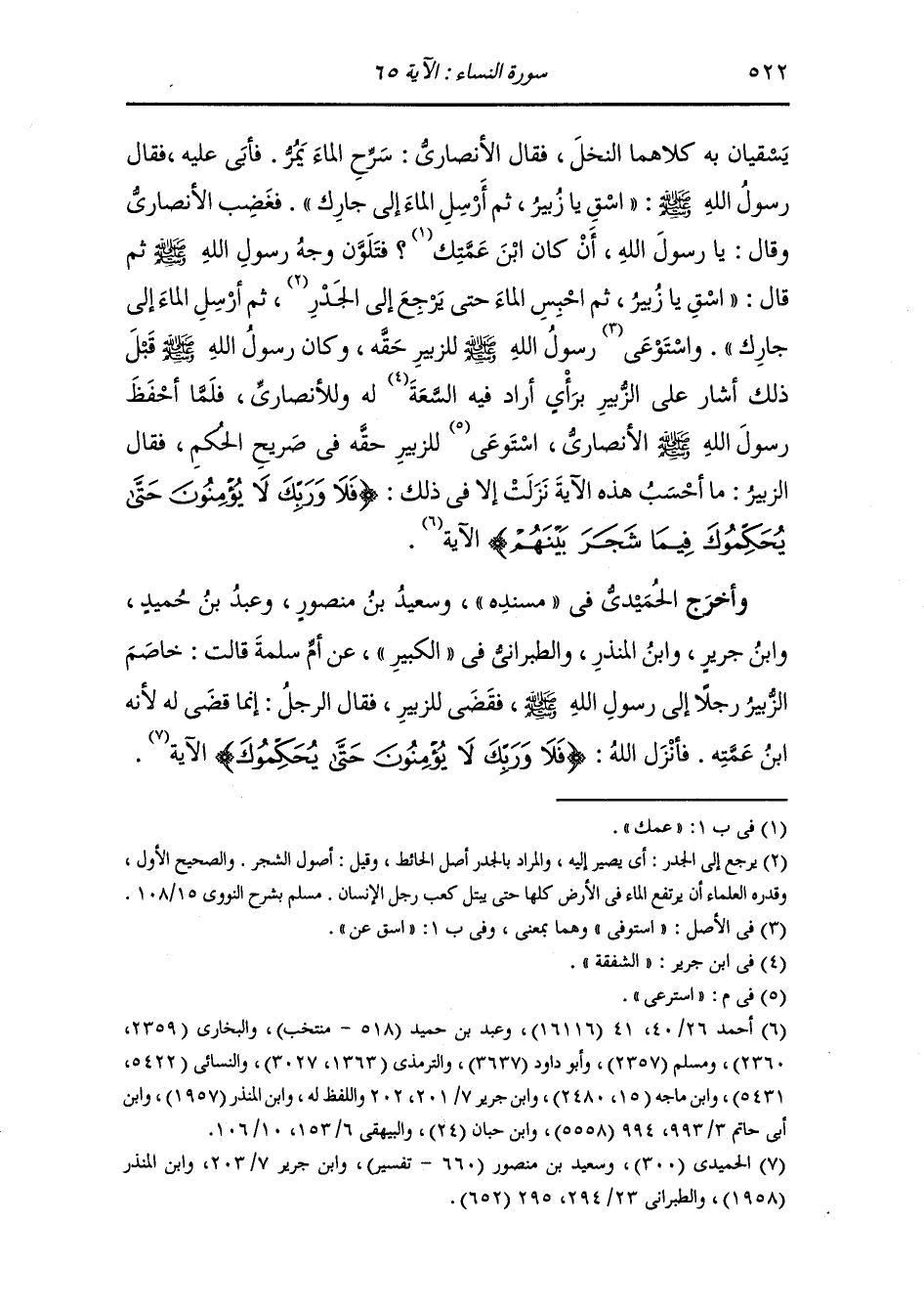 وأخرج ابن أبي حاتم عن سعيد بن المسيب في قوله {فلا وربك لا يؤمنون} الآية ، قال : أنزلت في الزبير بن العوام وحاطب بن أبي بلتعة اختصما في ماء فقضى النَّبِيّ صلى الله عليه وسلم أن يسقي الأعلى ثم الأسفل.