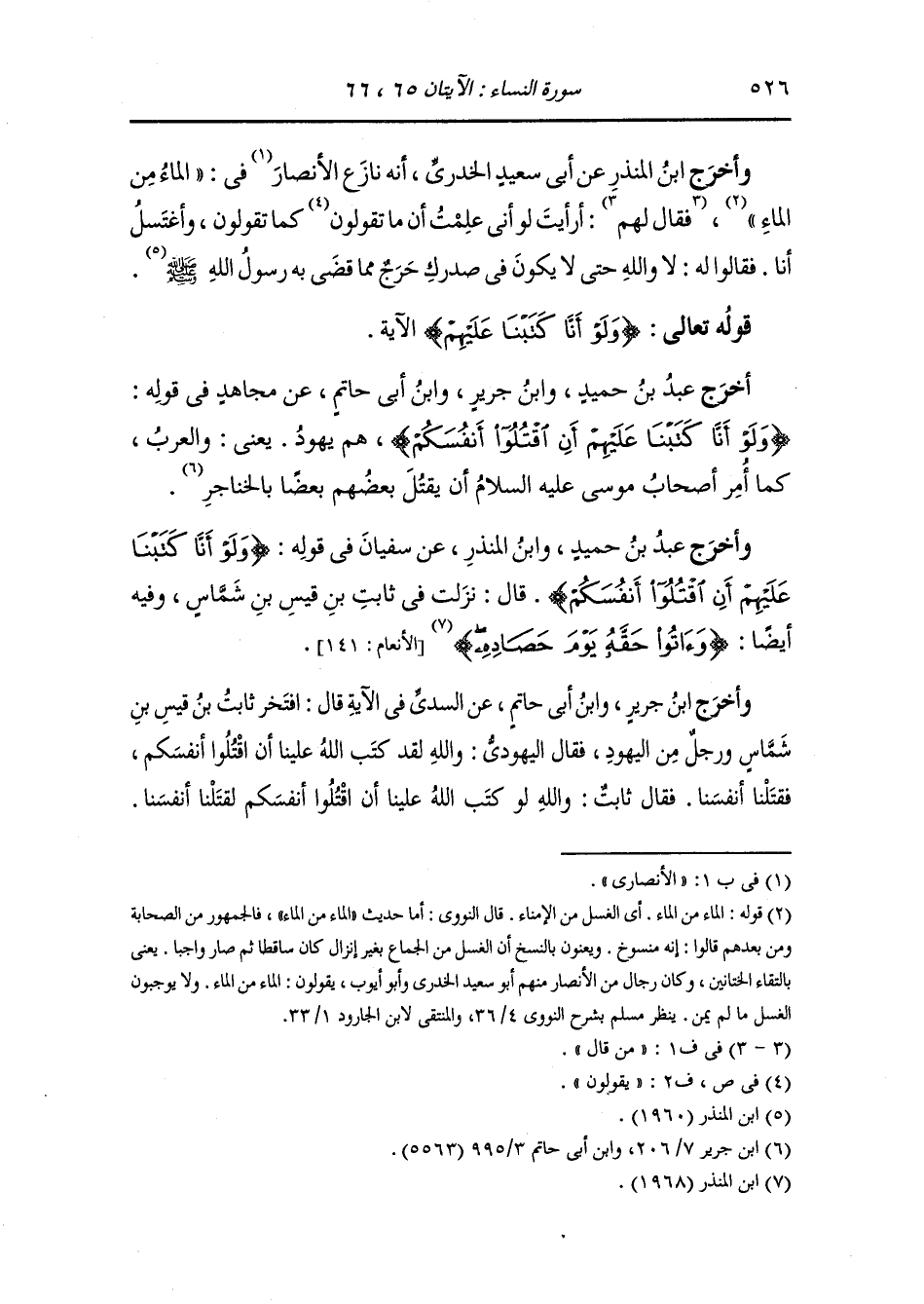 وأخرج ابن أبي حاتم عن عامر بن عبد الله بن الزبير قال : نزلت {ولو أنا كتبنا عليهم أن اقتلوا أنفسكم} قال أبو بكر : يا رسول الله - والله - لو أمرتني أن أقتل نفسي لفعلت ، قال : صدقت يا أبا بكر