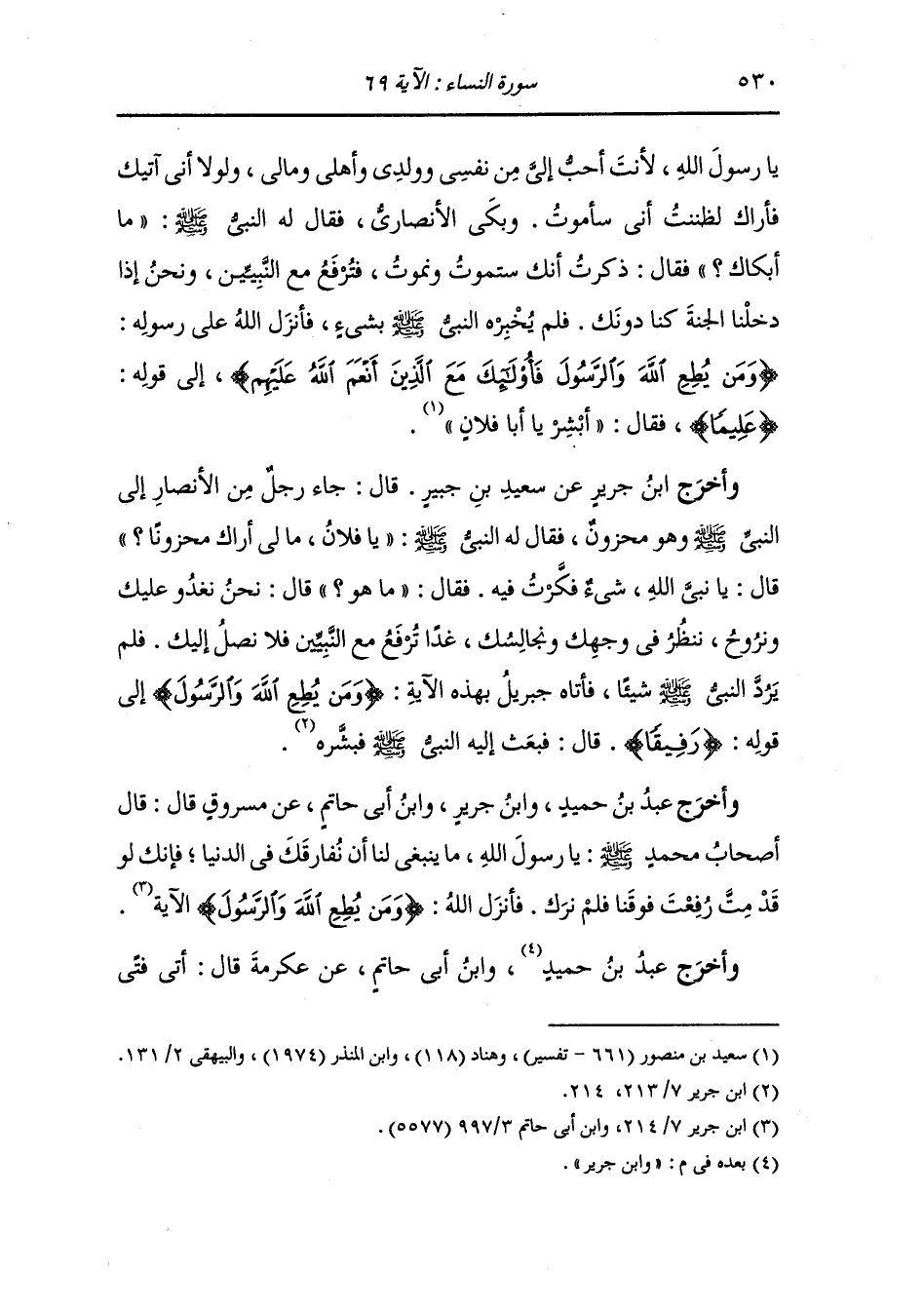 وأخرج ابن جرير عن السدي قال : قال ناس من الأنصار : يا رسول الله إذا أدخلك الله الجنة فكنت في أعلاها ونحن نشتاق إليك فكيف نصنع فأنزل الله {ومن يطع الله والرسول} الآية.