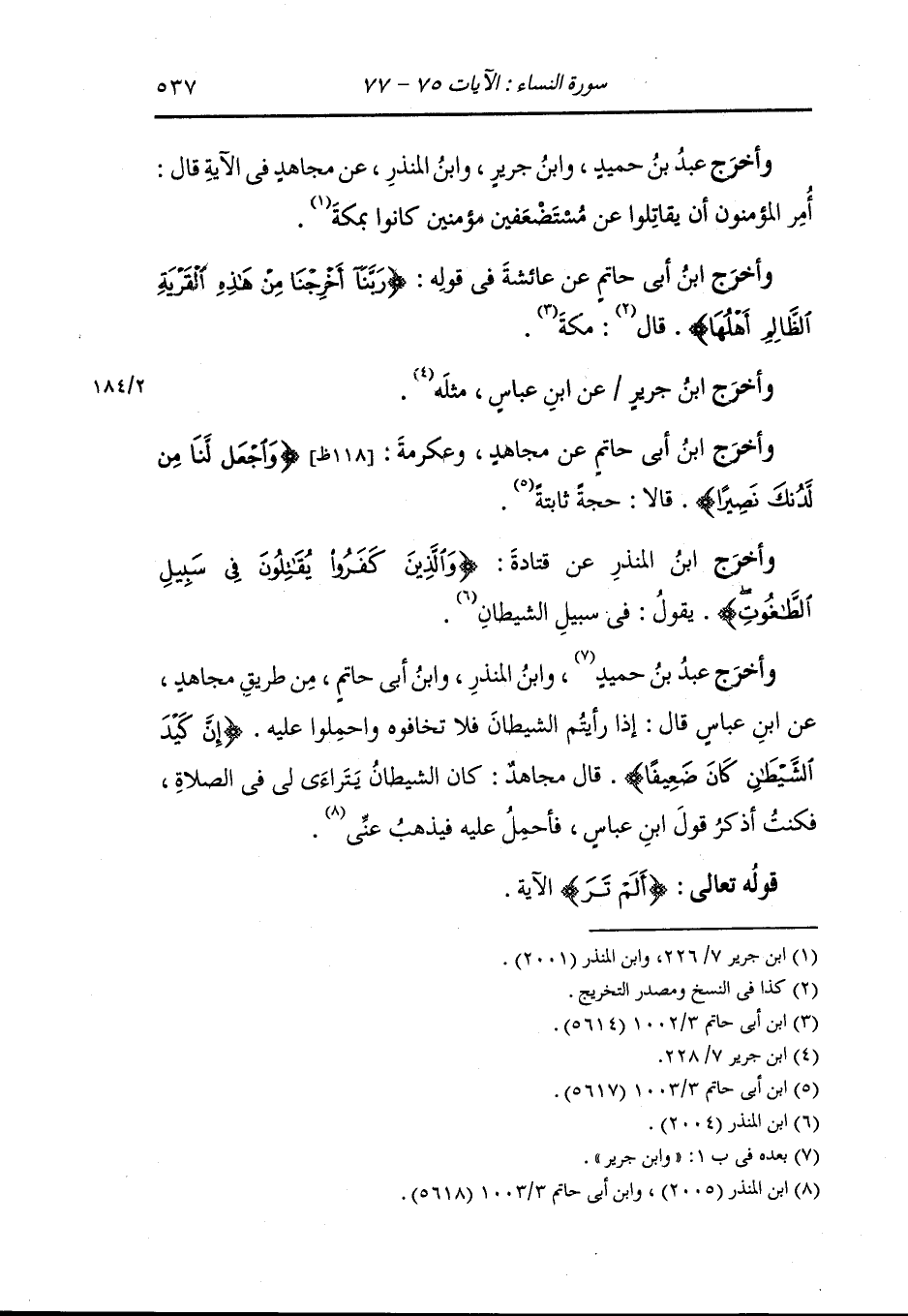 أخرج النسائي ، وَابن جَرِير ، وَابن أبي حاتم والحاكم وصححه والبيهقي في "سُنَنِه" من طريق عكرمة عن ابن عباس أن عبد الرحمن بن عوف وأصحابا له أتوا النَّبِيّ صلى الله عليه وسلم فقالوا يا نبي الله كنا في عز ونحن مشركون فلما آمنا صرنا أذلة ، فقال : إني أمرت بالعفو فلا تقاتلوا القوم ، فلما حوله الله إلى المدينة أمره الله بالقتال فكفوا ، فأنزل الله {ألم تر إلى الذين قيل لهم كفوا أيديكم} الآية.
