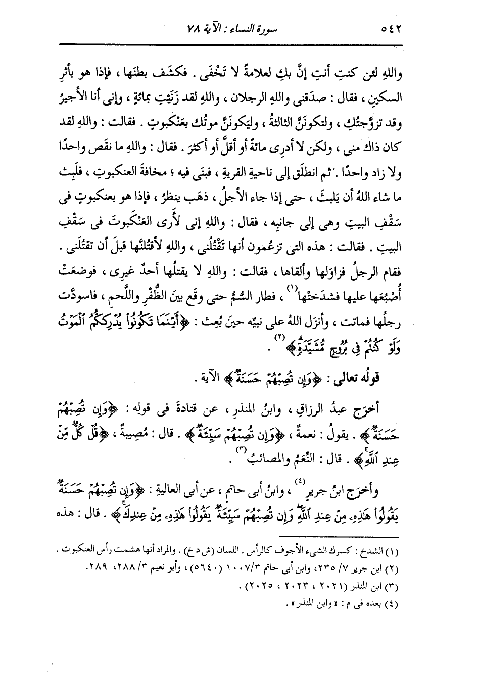 وأخرج ابن جرير عن ابن زيد في قوله {وإن تصبهم حسنة} الآية ، قال : إن هذه الآيات نزلت في شأن الحرب {قل كل من عند الله} قال : النصر والهزيمة.