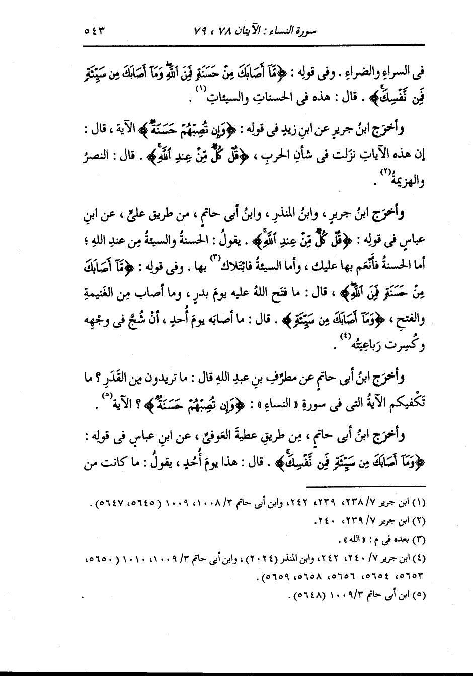 وأخرج سعيد ين منصور ، وعَبد بن حُمَيد ، وَابن جَرِير ، وَابن المنذر ، وَابن أبي حاتم عن أبي صالح {وما أصابك من سيئة فمن نفسك} وأنا قدرتها عليك.
