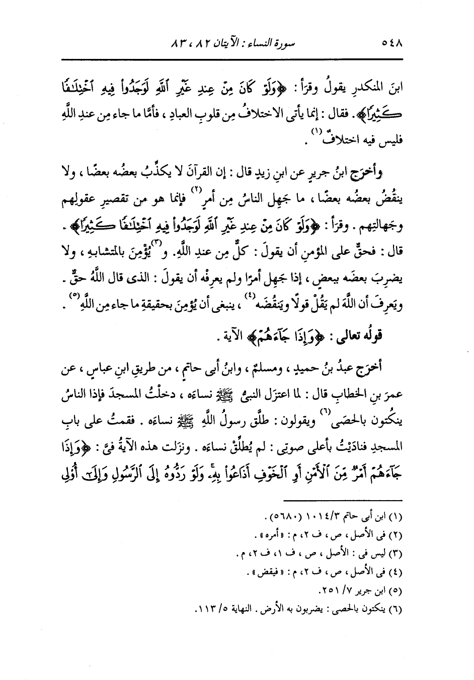 الأمر منهم لعلمه الذين يستنبطونه منهم} فكنت أنا استنبطت ذلك الأمر ، وأحرج ابن جرير ، وَابن أبي حاتم من طريق العوفي عن ابن عباس في قوله {وإذا جاءهم أمر من الأمن أو الخوف أذاعوا به} يقول : أفشوه وسعوا به {ولو ردوه إلى الرسول وإلى أولي الأمر منهم لعلمه الذين يستنبطونه منهم} يقول : لعلمه الذين يتجسسونه منهم.