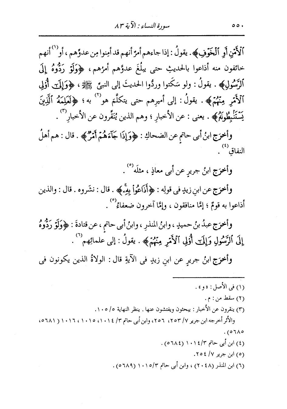 وأخرج عَبد بن حُمَيد ، وَابن جَرِير ، وَابن أبي حاتم عن مجاهد {لعلمه الذين يستنبطونه منهم} قال : قولهم ماذا كان وما سمعتم.
