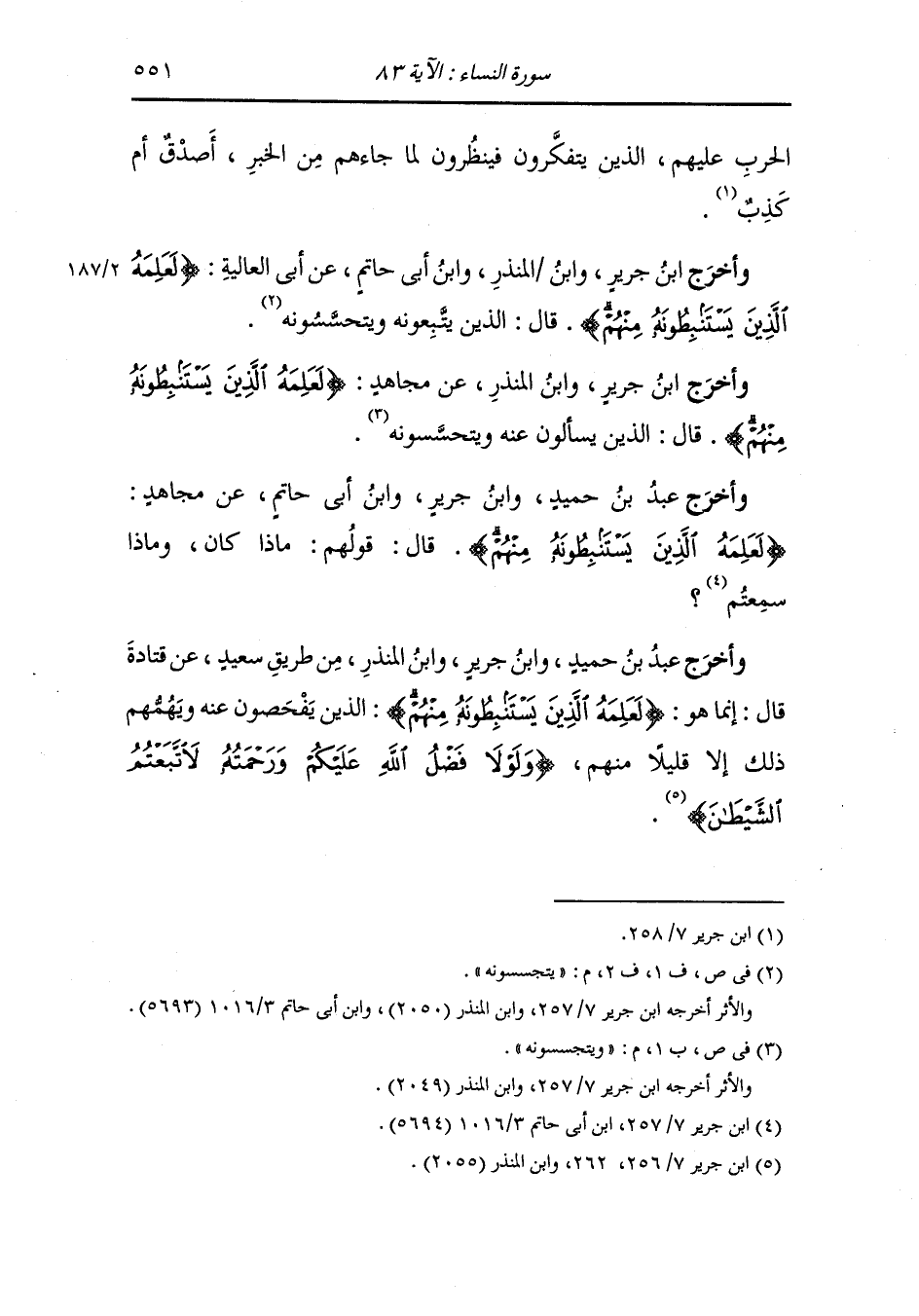 وأخرج ابن جرير ، وَابن المنذر ، وَابن أبي حاتم من طريق علي عن ابن عباس في قوله {ولولا فضل الله عليكم ورحمته لاتبعتم الشيطان} قال : فانقطع الكلام ، وقوله {إلا قليلا} فهو في أول الآية يخبر عن المنافقين قال {وإذا جاءهم أمر من الأمن أو الخوف أذاعوا به} إلا قليلا ، يعني بالقليل المؤمنين.
