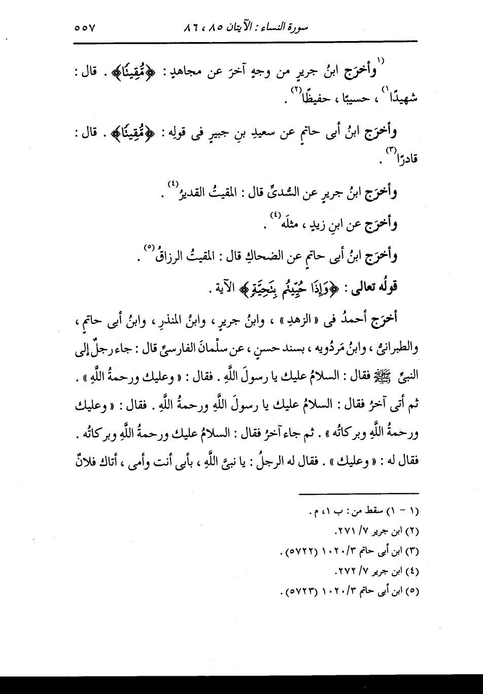 وفلان فسلما عليك فرددت عليهما أكثر مما رددت علي فقال : إنك لم تدع لنا شيئا قال الله {وإذا حييتم بتحية فحيوا بأحسن منها أو ردوها} فرددناها عليك.
