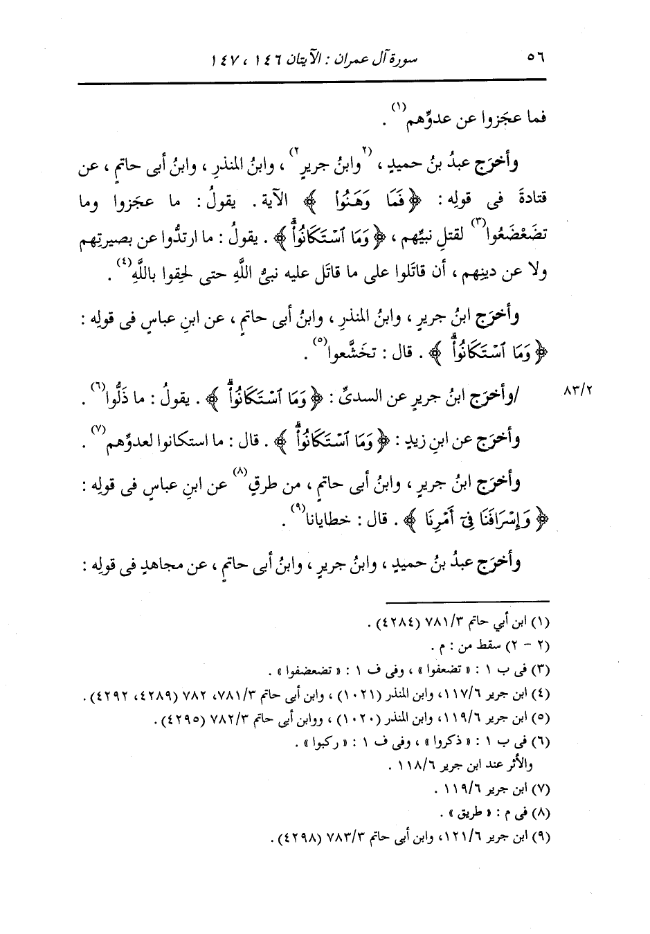 وأخرج ابن أبي حاتم عن أبي مالك {فما وهنوا لما أصابهم في سبيل الله} يعني