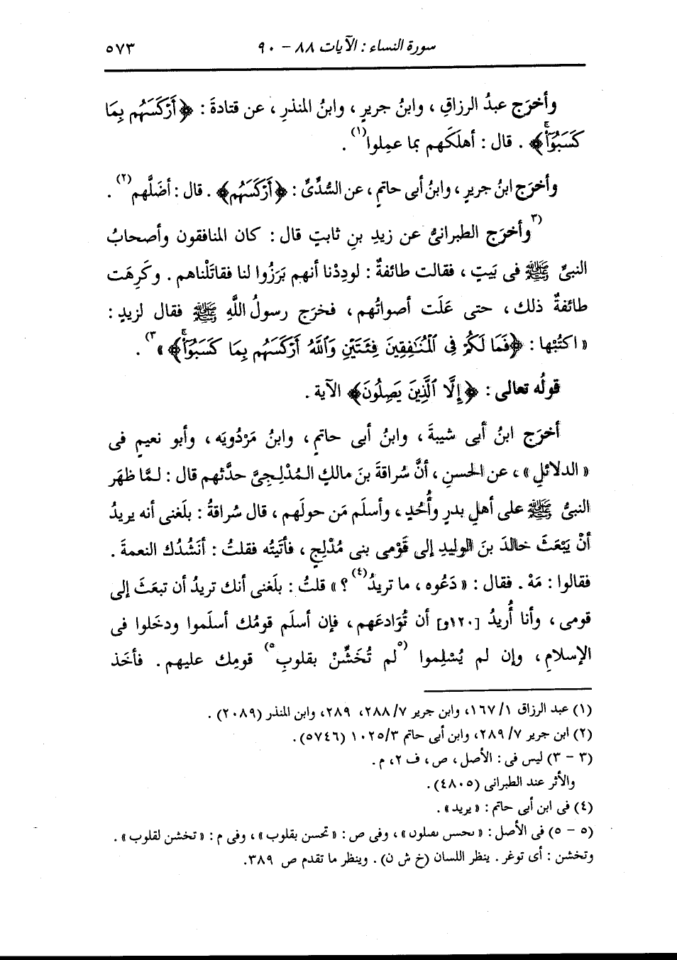 وأخرج ابن جرير عن السدي قال : كان ناس من المنافقين أرادوا أن يخرجوا من المدينة فقالوا للمؤمنين : إنا قد أصابنا أوجاع في المدينة واتخمناها فلعلنا أن نخرج إلى الظهر حتى نتماثل ثم نرجع فإنا كنا أصحاب برية ، فانطلقوا واختلف فيهم أصحاب النَّبِيّ صلى الله عليه وسلم فقالت طائفة : أعداء الله منافقون وددنا أن رسول الله صلى الله عليه وسلم أذن لنا فقاتلناهم ، وقالت طائفة : لا بل إخواننا تخمتهم المدينة