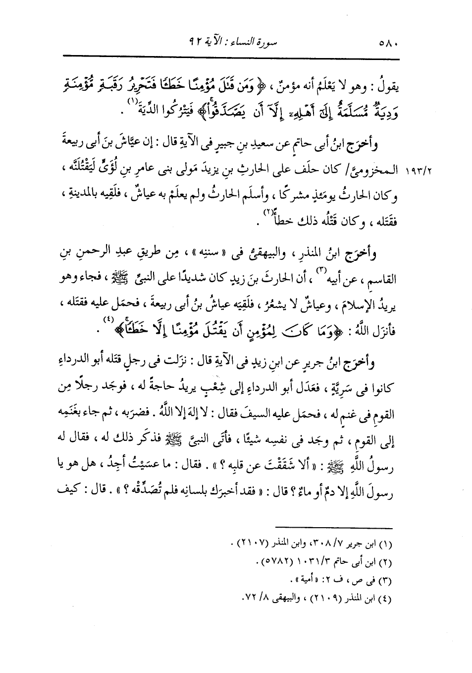 وأخرج ابن جرير ، وَابن المنذر ، وَابن أبي حاتم من طريق علي عن ابن عباس في قوله {فتحرير رقبة مؤمنة} قال : يعني بالمؤمنة من قد عقل الإيمان وصام وصلى وكل رقبة في القرآن لم تسم مؤمنة فإنه يجوز المولود فما فوقه ممن ليس به زمانة وفي قوله {ودية مسلمة إلى أهله إلا أن يصدقوا} قال : عليه الدية مسلمة إلا أن يتصدق بها عليه.