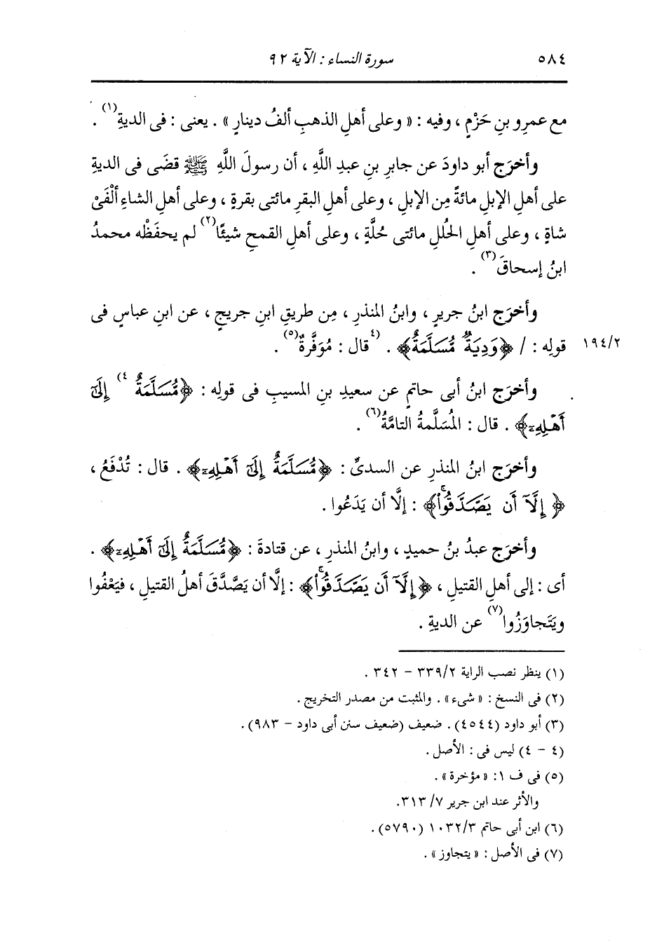 وأخرج ابن أبي حاتم عن سعيد بن جبير {ودية مسلمة} يعني يسلمها عاقلة القاتل إلى أهله إلى أولياء المقتول {إلا أن يصدقوا} يعني إلا أن يصدق أولياء المقتول بالدية على القاتل فهو خير لهم فأما عتق رقبة فإنه واجب على القاتل في ماله.