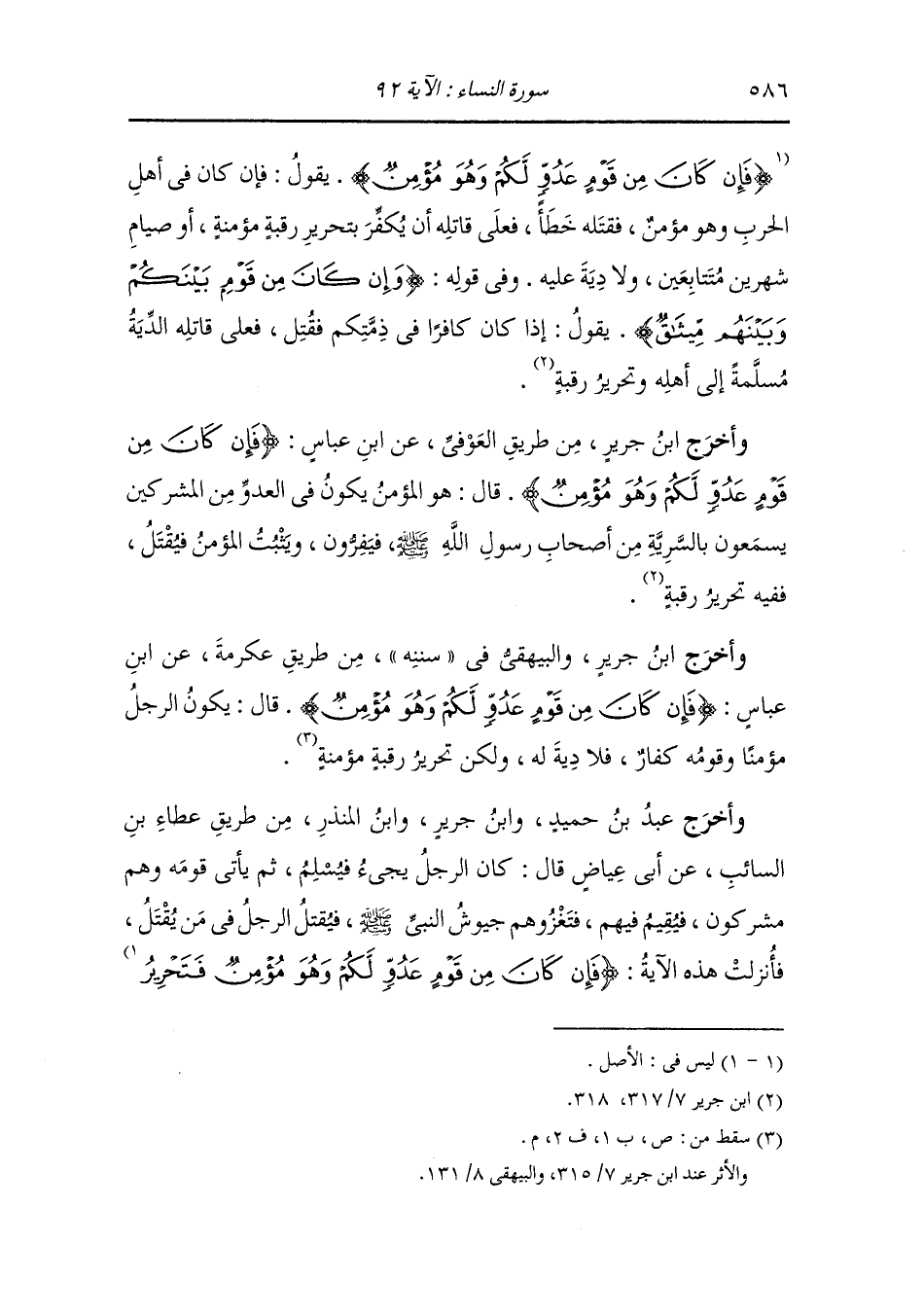 رقبة مؤمنة} وليست له دية ، واخرج ابن أبي شيبة ، وَابن المنذر ، وَابن أبي حاتم والطبراني والحاكم وصححه والبيهقي في "سُنَنِه" من طريق عطاء بن السائب عن أبي يحيى عن ابن عباس في قوله {فإن كان من قوم عدو لكم وهو مؤمن} قال : كان الرجل يأتي النَّبِيّ صلى الله عليه وسلم فيسلم ثم يرجع إلى قومه فيكون فيهم وهم مشركون فيصيبه المسلمون خطأ في سرية أو غارة فيعتق الذي يصيبه رقبة وفي قوله {وإن كان من قوم بينكم وبينهم ميثاق} قال : كان الرجل يكون معاهدا وقومه أهل عهد فيسلم إليهم ديته ويعتق الذي أصابه رقبة.