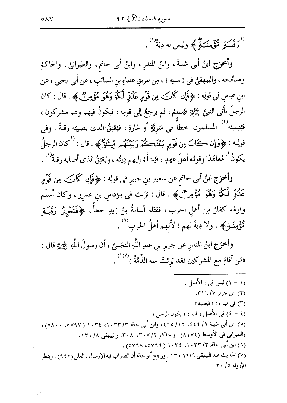 وأخرج ابن أبي حاتم عن ابن شهاب {وإن كان من قوم بينكم وبينهم ميثاق فدية مسلمة إلى أهله} قال : بلغنا أن دية المعاهد