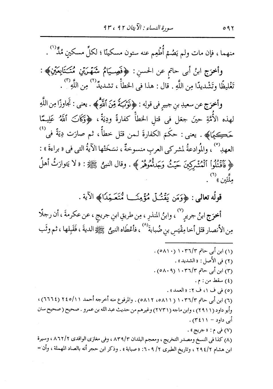 وأخرج ابن أبي حاتم عن سعيد بن جبير في قوله {ومن يقتل مؤمنا متعمدا فجزاؤه جهنم} قال : نزلت في مقيس بن ضبابة الكناني وذلك أنه أسلم وأخوه هشام بن ضبابة وكانا بالمدينة فوجد مقيس أخاه هشاما ذات يوم قتيلا في الأنصار في بني النجار فانطلق إلى النَّبِيّ صلى الله عليه وسلم فأخبره بذلك فأرسل رسول الله صلى الله عليه وسلم رجلا من قريش من بني فهر ومعه مقيس إلى بني النجار - ومنازلهم يومئذ بقباء - أن ادفعوا إلى مقيس قاتل أخيه إن علمتم ذلك وإلا فادفعوا إليه الدية ، فلما جاءهم الرسول قالوا : السمع والطاعة لله وللرسول والله ما نعلم له قاتلا ولكن نؤدي إليه الدية فدفعوا إلى مقيس مائة من الإبل دية أخيه فلما انصرف مقيس والفهري راجعين من