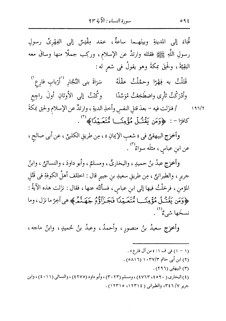 الجعد عن ابن عباس أن رجلا أتاه فقال : أرأيت رجلا قتل رجلا متعمدا قال {فجزاؤه جهنم خالدا فيها وغضب الله عليه ولعنه وأعد له عذابا عظيما} قال : لقد نزلت في آخر ما نزل ما نسخها شيء حتى قبض رسول الله صلى الله عليه وسلم وما نزل وحي بعد رسول الله صلى الله عليه وسلم ، قال : أرأيت إن تاب وآمن وعمل صالحا ثم اهتدى قال : وأنى له بالتوبة وقد سمعت رسول الله صلى الله عليه وسلم يقول : ثكلته أمه رجل قتل رجلا متعمدا يجيء يوم القيامة آخذا قاتله بيمينه أو بيساره وآخذا رأسه بيمينه أو بشماله تشخب أوداجه دما في قبل العرش يقول : يا رب سل عبدك فيم قتلني.