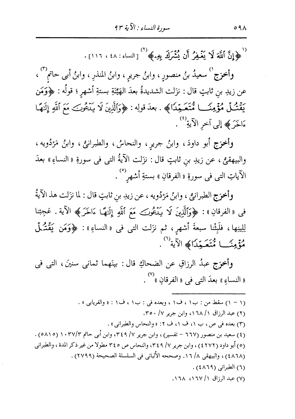 وأخرج سمويه في فوائده عن زيد بن ثابت قال : نزلت هذه التي في النساء بعد قوله (ويغفر ما دون ذلك لمن يشاء) (النساء الآية 48) بأربعة أشهر.