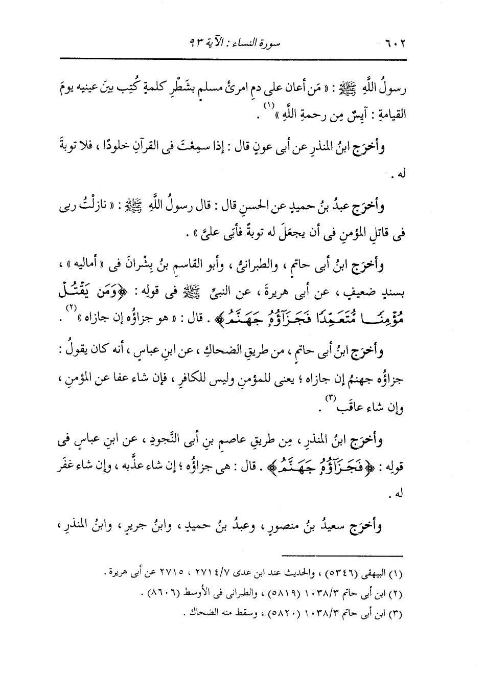وأخرج عَبد بن حُمَيد ، وَابن المنذر والبيهقي في البعث عن هشام بن حسان قال : كنا عند محمد بن سيرين فقال له رجل (ومن يقتل مؤمنا متعمدا فجزاؤه جهنم) حتى ختم الآية فغضب محمد وقال : أين أنت عن هذه الآية (إن الله لا يغفر أن يشرك به ويغفر ما دون ذلك لمن يشاء) قم عني اخرج عني قال : فأخرج