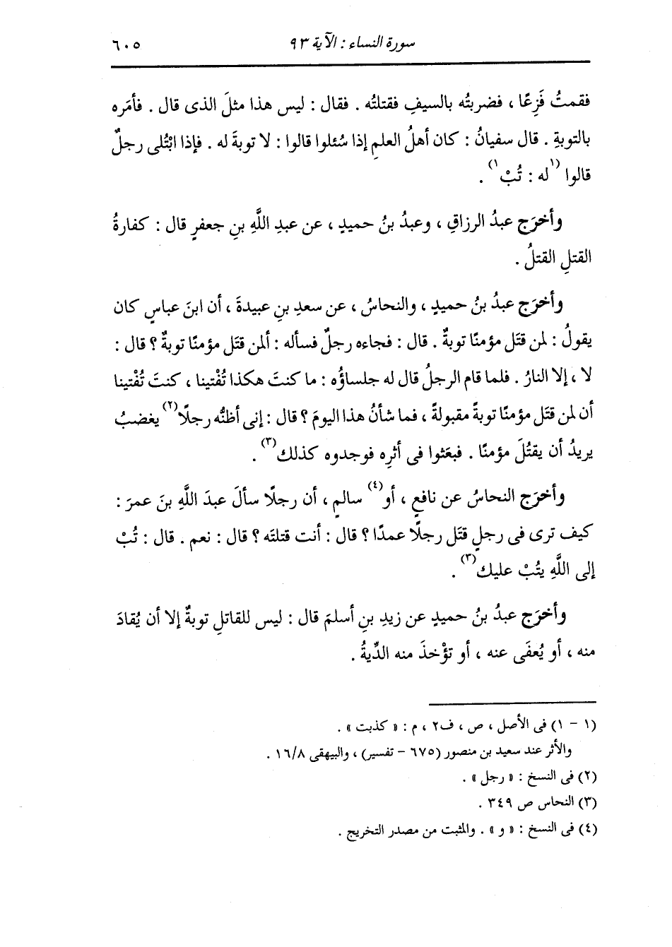 وأخرج عَبد بن حُمَيد عن سفيان قال : بلغنا أن الذي يقتل متعمدا فكفارته أن يقيد من نفسه أو أن يعفى عنه أو تؤخذ منه الدية فإن فعل به ذلك رجونا أن تكون كفارته ويستغفر ربه فإن لم يفعل من ذلك شيئا فهو في مشيئة الله إن شاء غفر له وإن شاء لم يغفر له فقال سفيان : فإذا جاءك من لم يقتل فشدد عليه ولا ترخص له لكي يفرض وإن كان ممن قتل فسألك فأخبره لعله يتوب ولا تؤيسه.