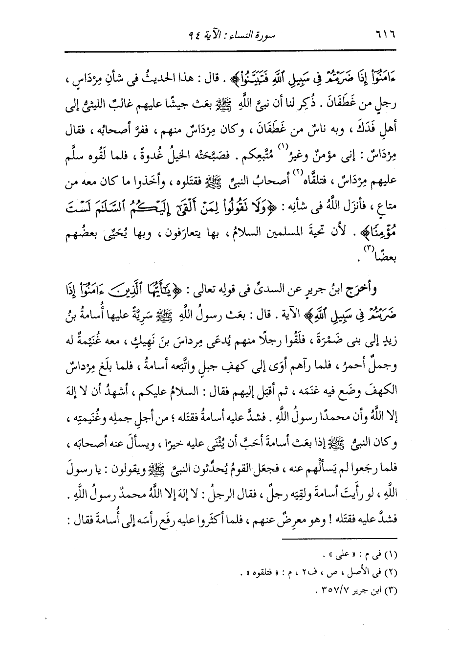 كيف أنت ولا إله إلا الله فقال : يا رسول الله إنما قالها متعوذا تعوذ بها ، فقال له رسول الله صلى الله عليه وسلم : هلا شققت عن قلبه فنظرت إليه ، فأنزل الله خبر هذا وأخبر إنما قتله من أجل جمله وغنمه فذلك حين يقول {تبتغون عرض الحياة الدنيا} فلما بلغ {فمن الله عليكم} يقول : فتاب الله عليكم فحلف أسامة أن لا يقاتل رجلا يقول لا إله إلا الله بعد ذلك الرجل وما لقي من رسول الله صلى الله عليه وسلم فيه.