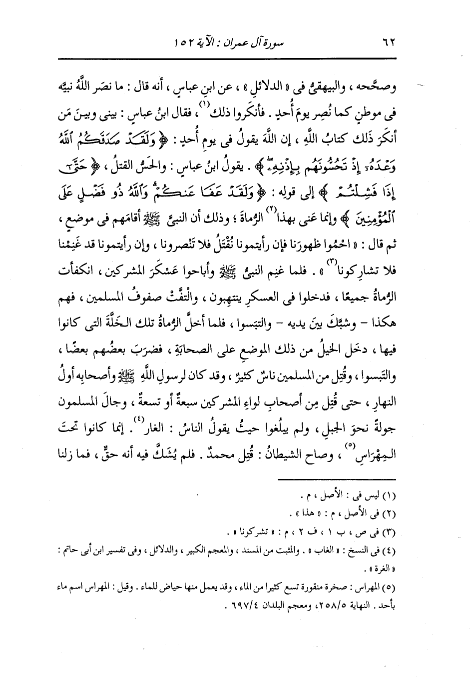 من جانب آخر فقال : لا تبرحوا حتى أوذنكم وأقبل أبو سفيان يحمل اللات والعزى فأرسل النَّبِيّ صلى الله عليه وسلم إلى الزبير أن يحمل فحمل على خالد بن الوليد فهزمه ومن معه فقال {ولقد صدقكم الله وعده إذ تحسونهم بإذنه} ، وأن الله وعدالمؤمنين أن ينصرهم وأنه معهم وأن رسول الله صلى الله عليه وسلم بعث بعضا من الناس فكانوا من ورائهم فقال رسول الله صلى الله عليه وسلم : كونوا ههنا فردوا وجه من ند منا وكونوا حرسا لنا من قبل ظهورنا ، وأن رسول الله صلى الله عليه وسلم لما هزم القوم هو وأصحابه الذين كانوا جعلوا من ورائهم فقال بعضهم لبعض لما رأوا النساء مصعدات في الجبل ورأوا الغنائم : انطلقوا إلى رسول الله صلى الله عليه وسلم فأدركوا الغنيمة قبل أن تستبقوا إليها وقالت طائفة أخرى : بل نطيع رسول الله صلى الله عليه وسلم فنثبت مكاننا ، فذلك قوله {منكم من يريد الدنيا} للذين أرادوا الغنيمة {ومنكم من يريد الآخرة} للذين قالوا : نطيع رسول الله صلى الله عليه وسلم ونثبت مكاننا ، فأتوا محمدا صلى الله عليه وسلم فكان فشلا حين تنازعوا بينهم يقول {وعصيتم من بعد ما أراكم ما تحبون} كانوا قد رأوا الفتح والغنيمة.