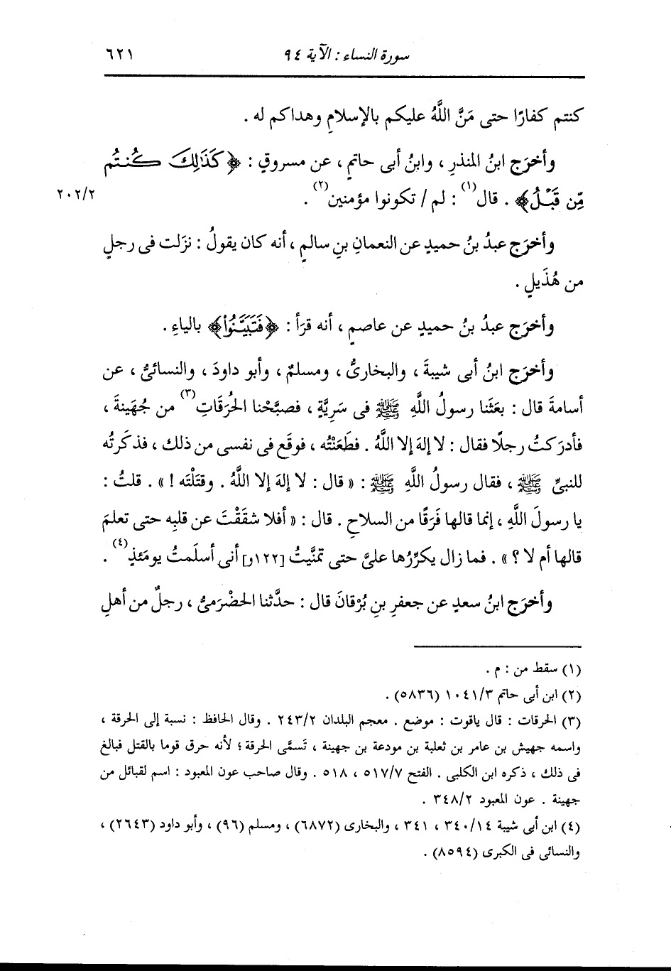 وأخرج ابن سعد ، وَابن أبي شيبة وأحمد والنسائي عن عقبة بن مالك الليثي قال : بعث رسول الله صلى الله عليه وسلم سرية فغارت على وقم فأتبعه رجل من السرية شاهرا فقال الشاذ من القوم : إني مسلم فلم ينظر فيما قال فضربه فقتله فنمي الحديث إلى رسول الله صلى الله عليه وسلم