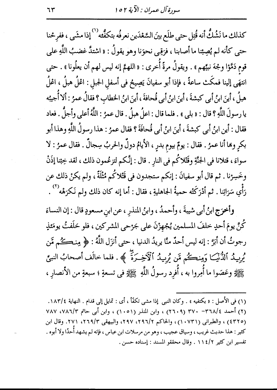 وصححه والبيهقي في الدلائل عن ابن عباس أنه قال ما نصر الله نبيه في موطن كما نصر يوم أحد فأنكروا ، فقال ابن عباس : بيني وبين من أنكر ذلك كتاب الله أن الله يقول في يوم أحد {ولقد صدقكم الله وعده إذ تحسونهم بإذنه} يقول ابن عباس : والحس : القتل ، {حتى إذا فشلتم} إلى قوله {ولقد عفا عنكم والله ذو فضل على المؤمنين} وإنما عنى هذا الرماة وذلك أن النَّبِيّ صلى الله عليه وسلم أقامهم في موضع ثم قال : احموا ظهورنا فإن رأيتمونا نقتل فلا تنصرونا وإن رأيتمونا قد غنمنا فلا تشركونا ، فلما غنم النَّبِيّ صلى الله عليه وسلم وأباحوا عسكر المشركين انكفأت الرماة جميعا فدخلوا في العسكر ينتهبون والتفت صفوف المسلمين فهم هكذا - وشبك بين يديه - والتبسوا فلما أخل الرماة تلك الخلة التي كانوا فيها دخل الخيل من ذلك الموضع على الصحابة فضرب بعضهم بعضا والتبسوا وقتل من المسلمين ناس كثير وقد كان لرسول الله صلى الله عليه وسلم وأصحابه أول النهار حتى قتل من أصحاب لواء المشركين سبعة أو تسعة وجال