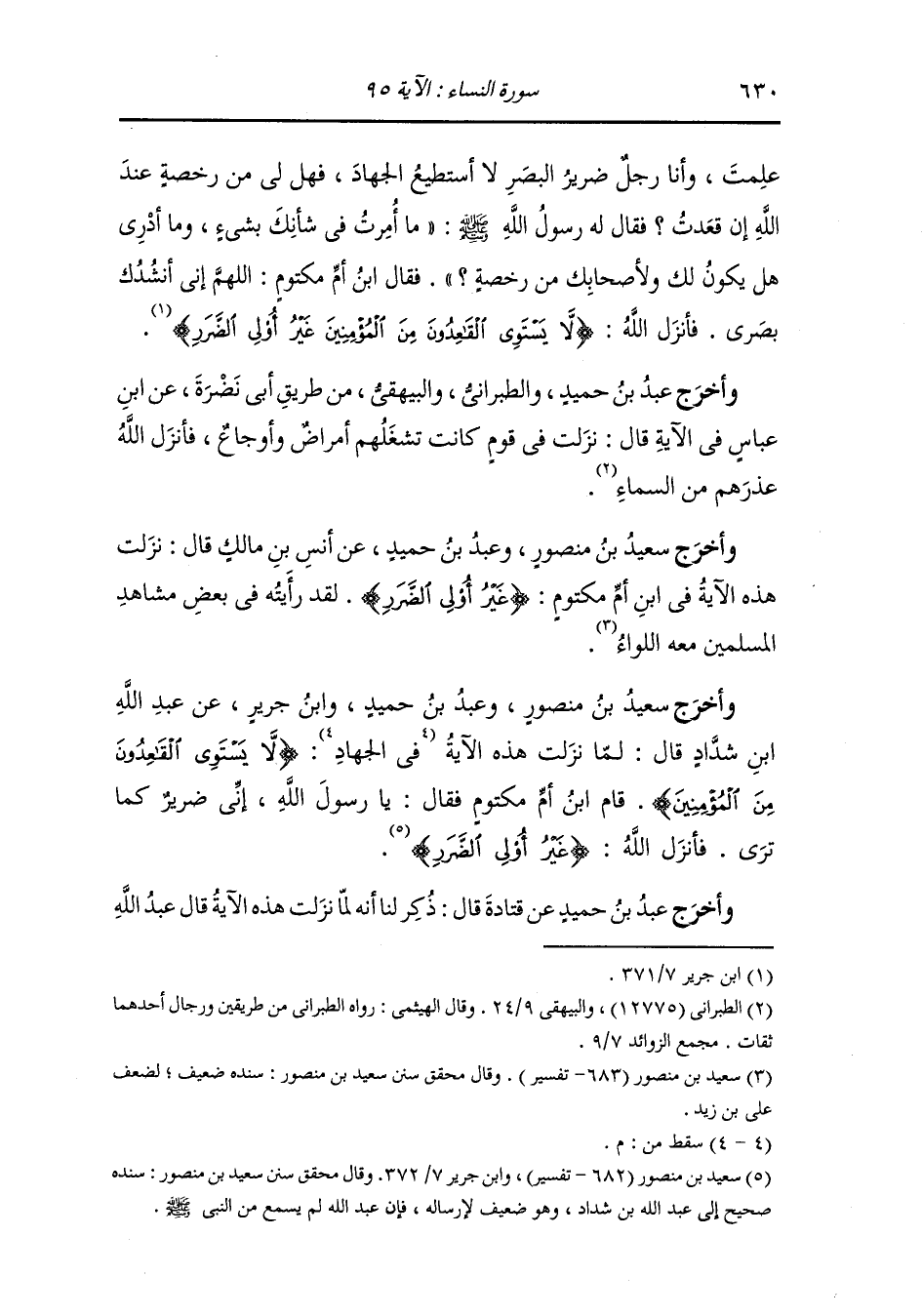 وأخرج ابن جرير عن سعيد قال : نزلت {لا يستوي القاعدون من المؤمنين غير أولي الضرر والمجاهدون في سبيل الله} فقال رجل أعمى : يا نبي الله فإني أحب الجهاد ولا أستطيع أن أجاهد ، فنزلت {غير أولي الضرر}.