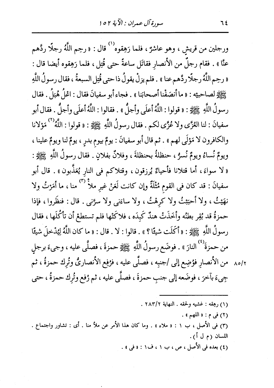 كذلك ما نشك أنه قتل حتى طلع بين السعدين نعرفه بتكفؤه إذا مشى ففرحنا حتى كأنه لم يصبنا ما أصابنا فرقي نحونا وهو يقول : اشتد غضب الله على قوم دموا وجه نبيهم ويقول مرة أخرى : اللهم إنه ليس لهم أن يعلونا حتى انتهى إلينا فمكث ساعة فإذا أبو سفيان يصيح في أسفل الجبل : أعل هبل أعل هبل ، أين ابن أبي كبشة أين ابن أبي قحافة أين ابن الخطاب فقال عمر : ألا أجيبه يا رسول الله قل : بلى ، فلما قال : أعل هبل ، قال عمر : الله أعلى وأجل ، فعاد فقال : أين ابن أبي كبشة أين ابن أبي قحافة فقال عمر : هذا رسول الله وهذا أبو بكر وها أنا عمر ، فقال : يوم بيوم بدر الأيام دول والحرب سجال فقال عمر : لا سواء ، قتلانا في الجنة وقتلاكم في النار قال : إنكم لتزعمون ذلك لقد خبنا إذن وخسرنا ، ثم أدركته حمية الجاهلية فقال : أما إنه كان ذلك ولم نكرهه.