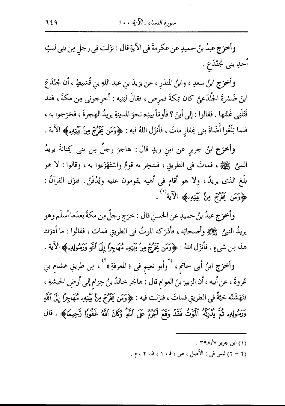 وأخرج ابن سعد عن المغيرة بن عبد الرحمن الخزاعي عن أبيه قال : خرج خالد بن حزام مهاجرا إلى أرض الحبشة في المرة الثانية فنهش في الطريق فمات قبل أن يدخل أرض الحبشة فنزلت فيه {ومن يخرج من بيته مهاجرا إلى الله ورسوله} الآية.