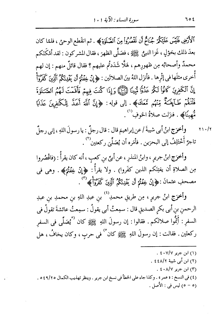 وأخرج ابن جرير عن أمية بن عبد الله أنه قال لعبد الله بن عمر : إنا نجد في كتاب الله قصر الصلاة في الخوف ولا نجد قصر صلاة المسافر فقال عبد الله : إنا وجدنا نبينا صلى الله عليه وسلم يعمل عملا عملنا به.