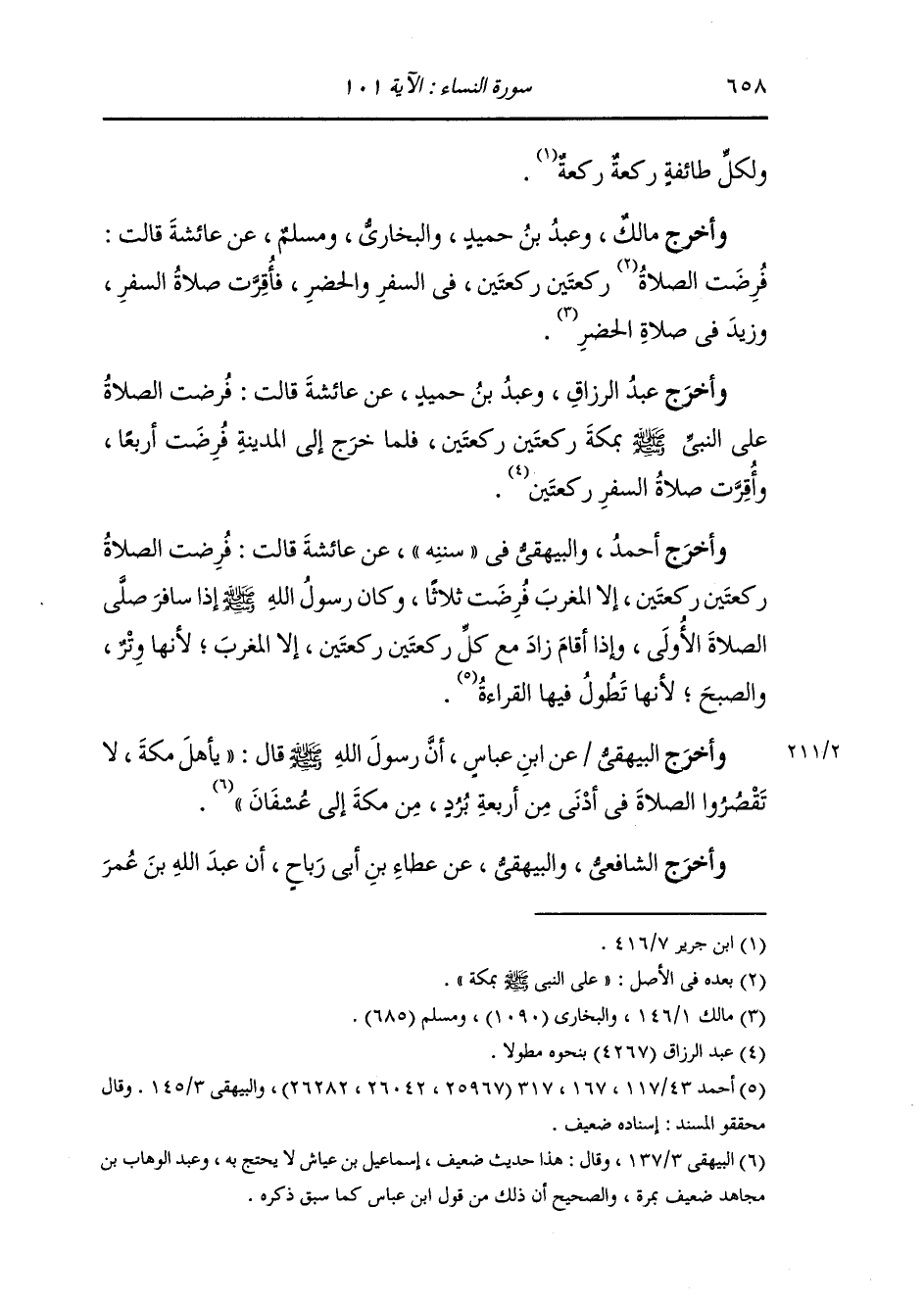 وأخرج ابن أبي شيبة ، وَابن جَرِير والنحاس عن ابن عباس قال : فرض الله الصلاة على لسان نبيكم في الحضر أربعا وفي السفر ركعتين وفي الخوف ركعة.