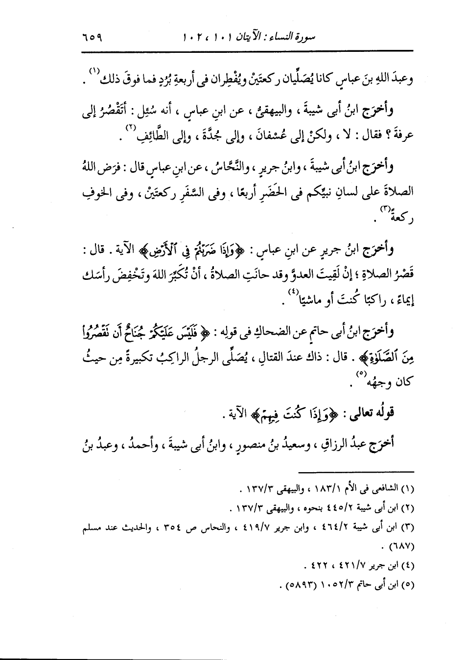 حميد وأبو داود والنسائي ، وَابن جَرِير ، وَابن المنذر ، وَابن أبي حاتم والدارقطني والطبراني والحاكم وصححه والبيهقي عن أبي عياش الزرقي قال : كنا مع رسول الله صلى الله عليه وسلم بعسفان فاستقبلنا المشركون عليهم خالد بن الوليد وهم بيننا وبين القبلة فصلى بنا النَّبِيّ صلى الله عليه وسلم الظهر فقالوا : قد كانوا على حال لو أصبنا غرتهم ثم قالوا : يأتي عليهم الآن صلاة هي أحب إليهم من أبنائهم وأنفسهم فنزل جبريل بهذه الآيات بين الظهر والعصر {وإذا كنت فيهم فأقمت لهم الصلاة} فحضرت فأمرهم رسول الله صلى الله عليه وسلم فأخذوا السلاح وصففنا خلفه صفين ثم ركع فركعنا جميعا ثم سجد بالصف الذي يليه والآخرون قيام يحرسونهم فلما سجدوا وقاموا جلس الآخرون فسجدوا في مكانهم ثم تقدم هؤلاء إلى مصاف هؤلاء وهؤلاء إلى مصاف هؤلاء