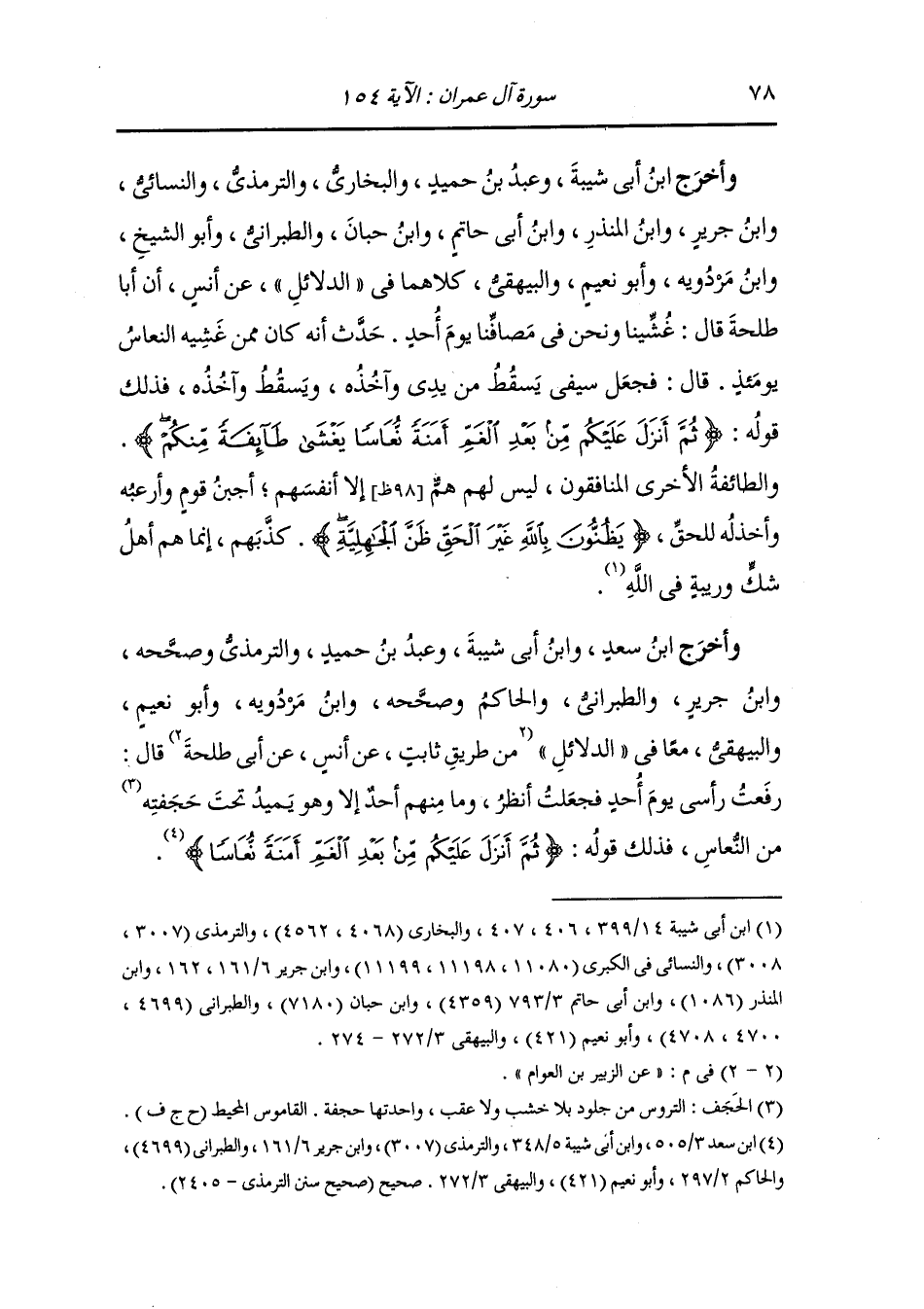 وأخرج ابن جرير ، وَابن المنذر ، وَابن أبي حاتم والطبراني والبيهقي في الدلائل عن المسور بن مخرمة قال : سألت عبد الرحمن بن عوف عن قول الله {ثم أنزل عليكم من بعد الغم أمنة نعاسا} قال : ألقي علينا النوم يوم أحد