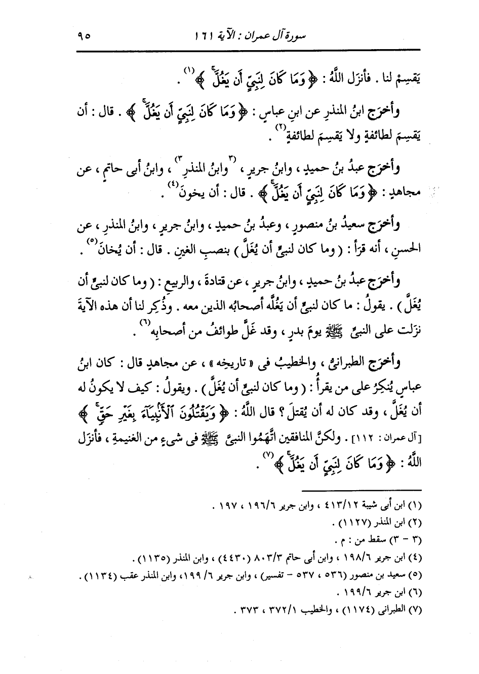 وأخرج ابن جرير ، وَابن أبي حاتم عن ابن عباس {وما كان لنبي أن يغل} قال : أن يقسم لطائفة من المسلمين ويترك طائفة ويجور في القسمة ولكن يقسم بالعدل ويأخذ فيه بأمر الله ويحكم فيه بما أنزل الله يقول : ما كان الله ليجعل نبيا يغل من أصحابه فإذا فعل ذلك النَّبِيّ صلى الله عليه وسلم استسنوا به.