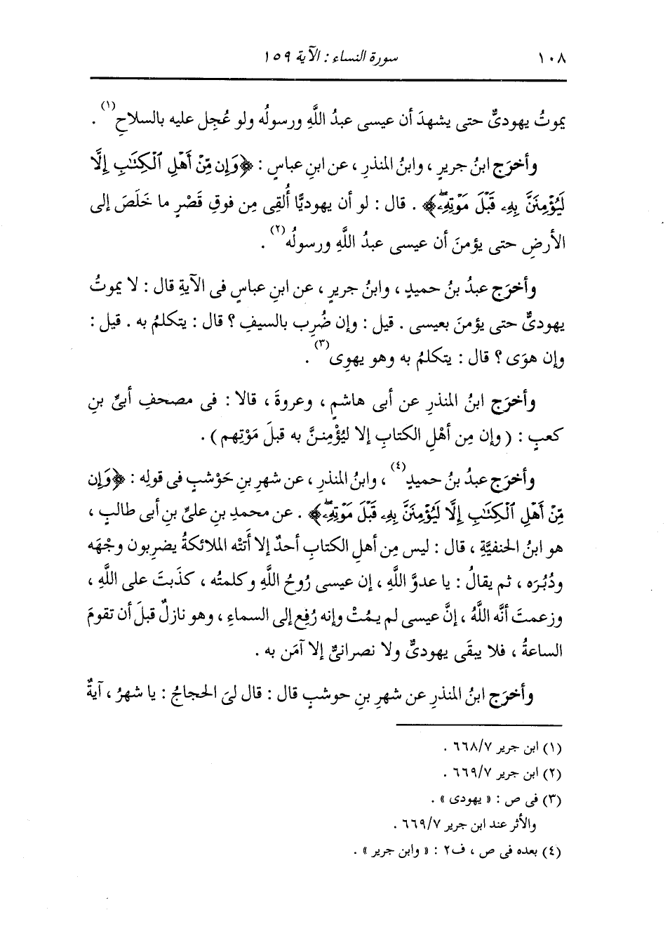 وأخرج ابن جرير ، وَابن أبي حاتم من طرق عن ابن عباس في قوله {وإن من أهل الكتاب إلا ليؤمنن به قبل موته} قال : قبل موت عيسى.
