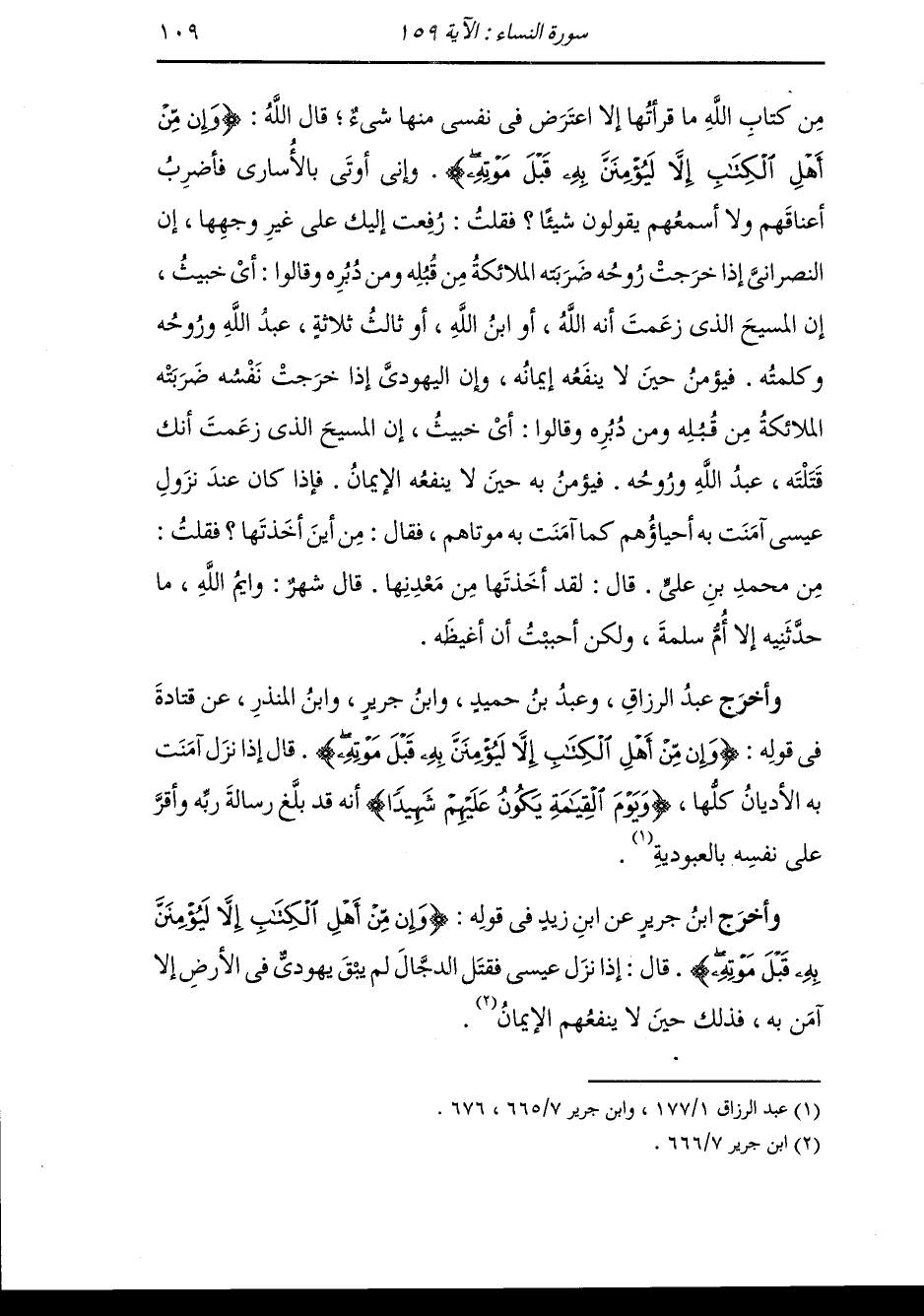 وأخرج الطيالسي وسعيد بن منصور ، وَابن جَرِير ، وَابن المنذر عن ابن عباس في قوله {وإن من أهل الكتاب إلا ليؤمنن به قبل موته} قال : هي في قراءة أبي قبل موتهم ، قال : ليس يهودي أبدا حتى يؤمن بعيسى ، قيل لابن عباس : أرأيت إن خر من فوق بيت قال : يتكلم به في الهواء ، فقيل : أرأيت إن ضرب عنق أحدهم قال : يتلجلج بها لسانه.