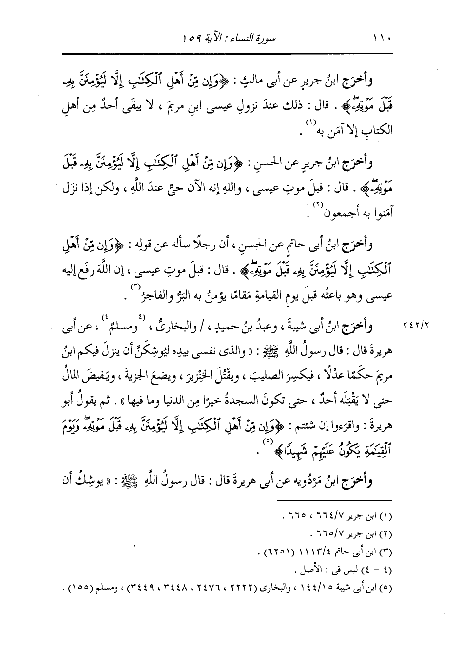 وأخرج ابن جرير ، وَابن المنذر عن ابن عباس {وإن من أهل الكتاب إلا ليؤمنن به قبل موته} قال : لو أن يهوديا ألقي من فوق قصر ما خلص إلى الأرض حتى يؤمن أن عيسى عبد الله ورسوله.