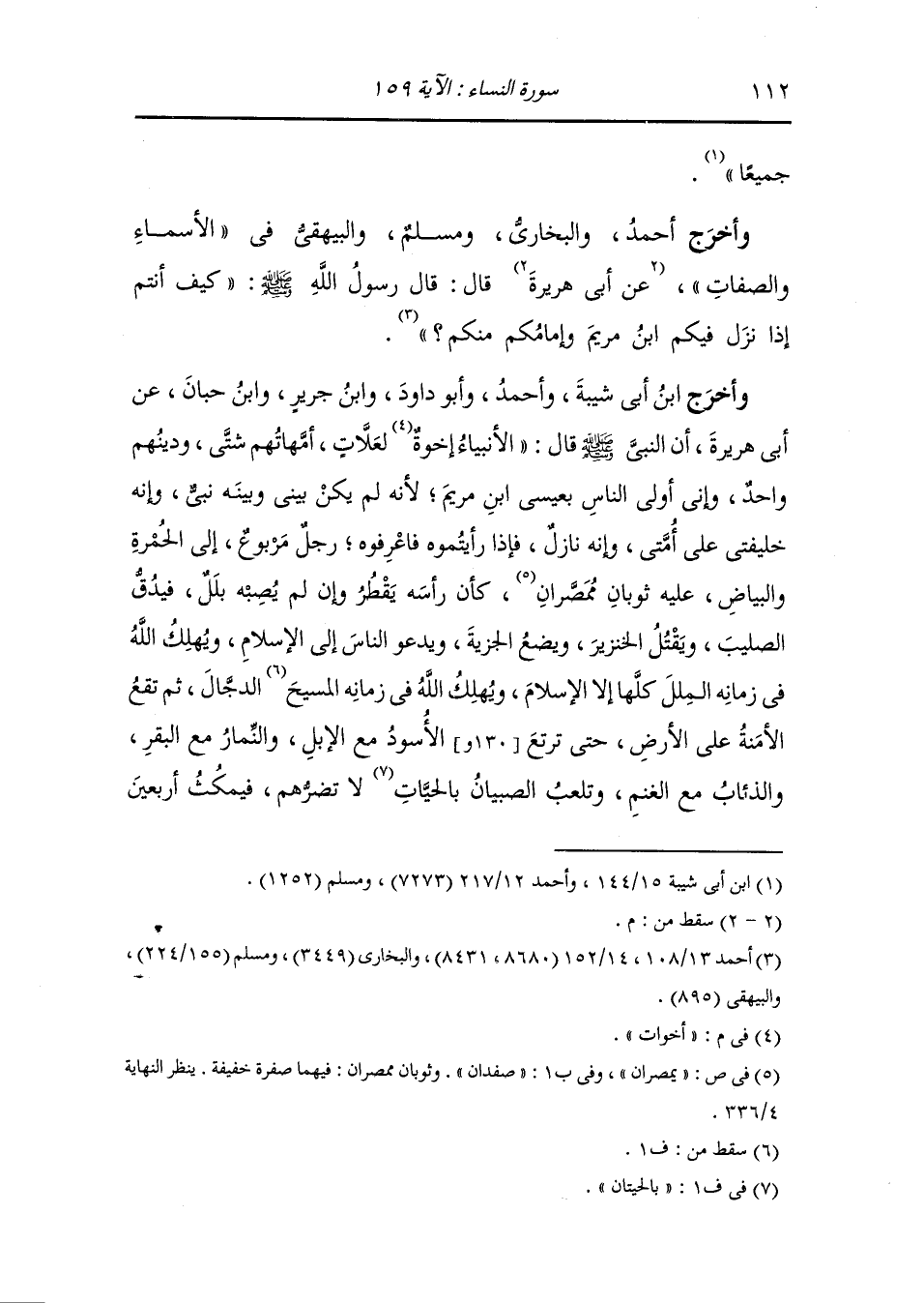 وأخرج ابن أبي شيبة ، وعَبد بن حُمَيد والبخاري ومسلم عن أبي هريرة قال : قال رسول الله صلى الله عليه وسلم : والذي نفسي بيده ليوشكن أن ينزل فيكم ابن مريم حكما عدلا فيكسر الصليب ويقتل الخنزير ويضع الجزية ويفيض المال حتى لا يقبله أحد حتى تكون السجدة خيرا من الدينا وما فيها ، ثم يقول أبو هريرة : واقرأوا إن شئتم {وإن من أهل الكتاب إلا ليؤمنن به قبل موته ويوم القيامة يكون عليهم شهيدا}.
