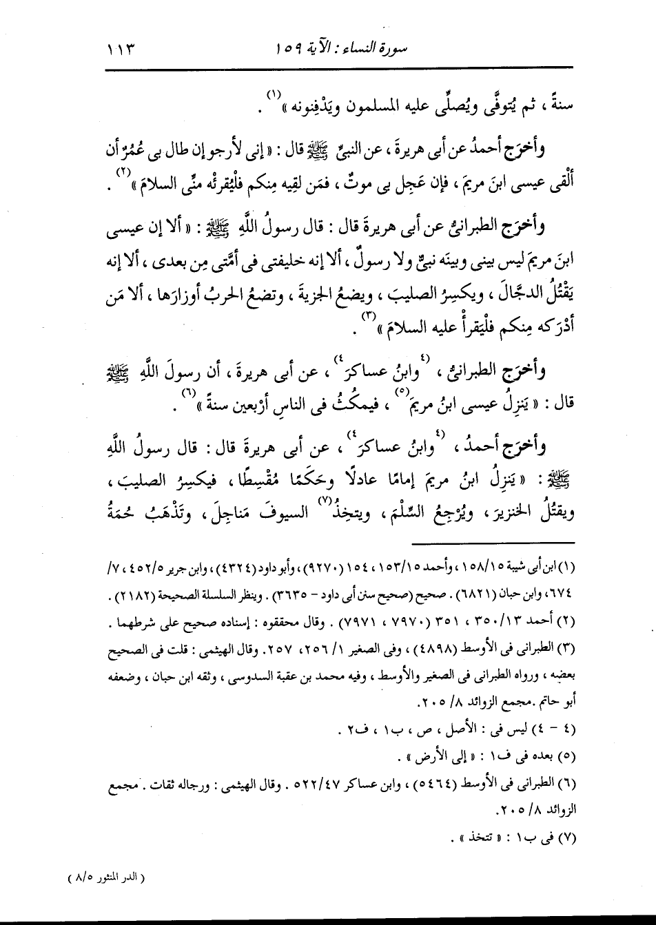 وأخرج أحمد ، وَابن جَرِير عن ابي هريرة قال : قال رسول الله صلى الله عليه وسلم : ينزل عيسى ابن مريم عليه السلام فيقتل الخنزير ويكسر الصليب ويجمع له الصلاة ويعطي المال حتى لا يقبل ويضع الخراج وينزل الروحاء فيحج منها أو يعتمر أو يجمعهما ، قال : وتلا أبو هريرة {وإن من أهل الكتاب إلا ليؤمنن به قبل موته ويوم القيامة يكون عليهم شهيدا} قال أبو هريرة : يؤمن به قبل موت عيسى.