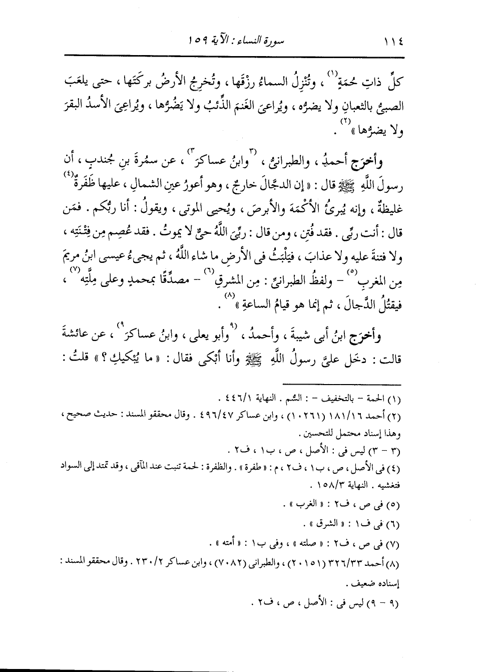 وأخرج ابن أبي شيبة وأحمد وأبو داود ، وَابن جَرِير ، وَابن حبان عن أبي هريرة أن النَّبِيّ صلى الله عليه وسلم قال : الأنبياء أخوات لعلات أمهاتهم شتى ودينهم واحد وإني أولى الناس بعيسى بن مريم لأنه لم يكن بيني وبينه نبي وإنه خليفتي على أمتي وأنه نازل فإذا رأيتموه فاعرفوه رجل مربوع إلى الحمرة والبياض عليه ثوبان ممصران كأن رأسه يقطر وإن لم يصبه بلل فيدق الصليب ويقتل الخنزير ويضع الجزية ويدعو الناس إلى الإسلام ويهلك الله في زمانه الملل كلها إلا الإسلام ويهلك الله في زمانه المسيح الدجال ثم تقع الأمنة على الأرض حتى ترتع الأسود مع الإبل والنمار مع البقر والذئاب مع الغنم وتلعب الصيبان بالحيات لا تضرهم فيمكث أربعين