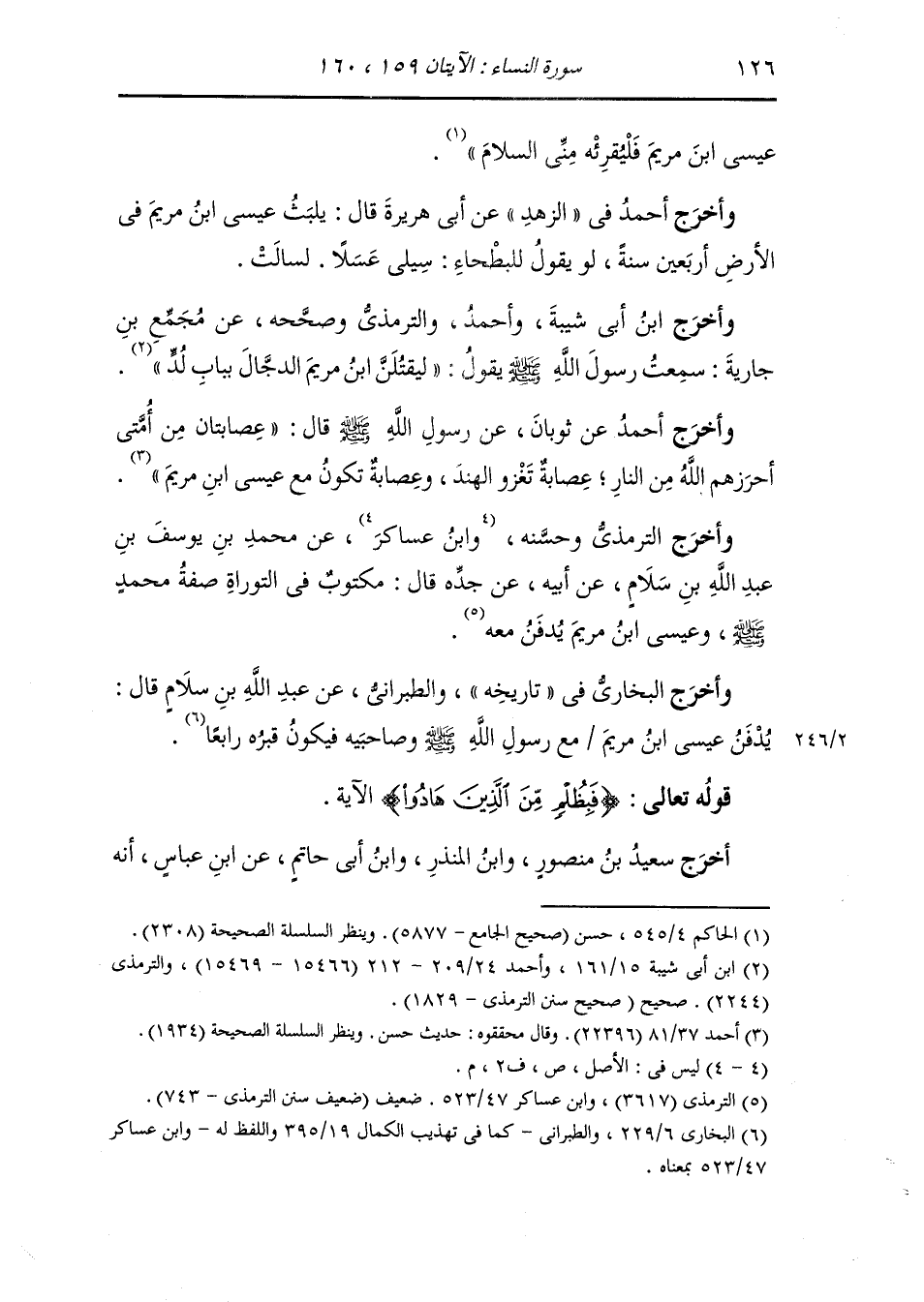 وأخرج ابن أبي شيبة والحكيم الترمذي والحاكم وصححه عن عبد الرحمن بن جبير بن نفير الحضرمي عن أبيه قال : لما اشتد جزع أصحاب رسول الله صلى الله عليه وسلم على من قتل يوم مؤتة قال رسول الله صلى الله عليه وسلم : ليدركن الدجال من هذه الأمة قوما مثلكم أو خيرا منكم ثلاث مرات ولن يخزي الله أمة أنا أولها وعيسى بن مريم آخرها قال الذهبي : مرسل وهو خبر منكر.