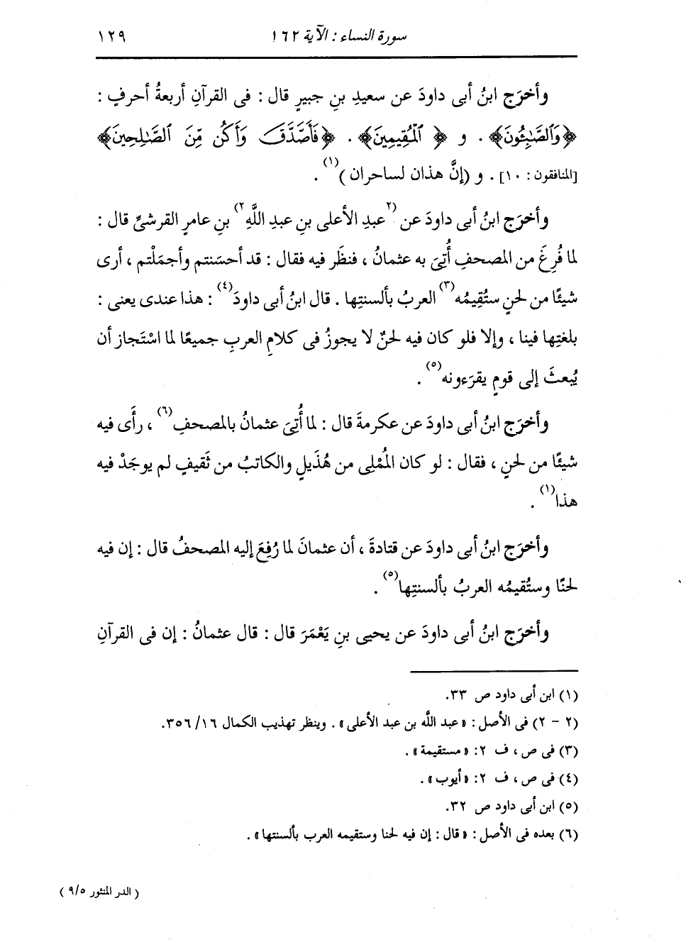 وأخرج عَبد بن حُمَيد ، وَابن جَرِير ، وَابن أبي داود في المصاحف ، وَابن المنذر عن الزبير بن خالد قال : قلت لأبان بن عثمان بن عفان : ما شأنها كتبت {لكن الراسخون في العلم منهم والمؤمنون يؤمنون بما أنزل إليك وما أنزل من قبلك والمقيمين الصلاة والمؤتون الزكاة} ما بين يديها وما خلفها رفع وهي نصب قال : إن الكاتب لما كتب {لكن الراسخون} حتى إذا بلغ قال : ما أكتب قيل له : اكتب {والمقيمين الصلاة} فكتب ما قيل له.
