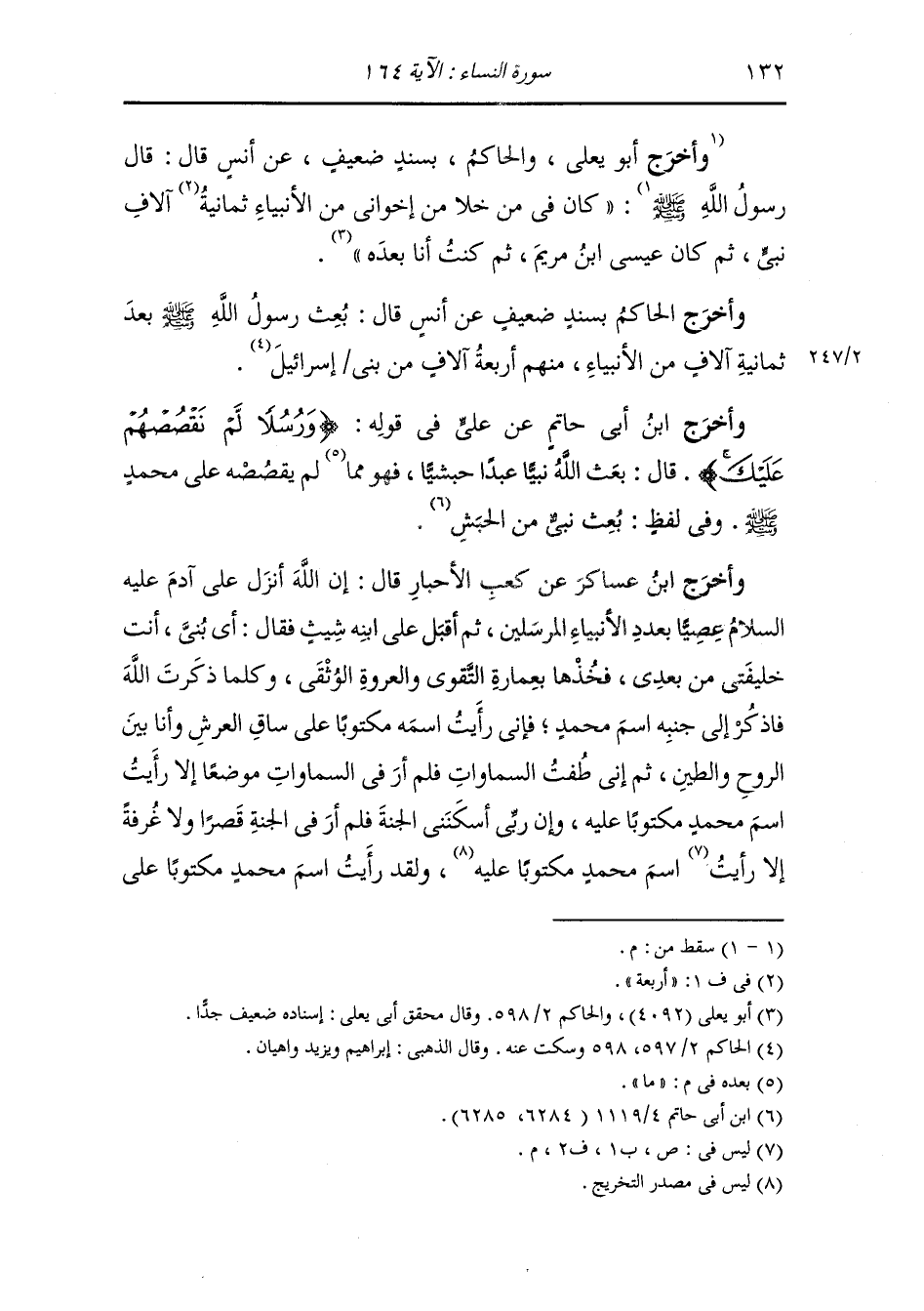 أخرج عَبد بن حُمَيد والحكيم الترمذي في نوادر الأصول ، وَابن حبان في صحيحه والحاكم ، وَابن عساكر عن أبي ذر قال : قلت : يا رسول الله كم الأنبياء قال : مائة ألف نبي وأربعة وعشرون ألفا ، قلت : يا رسول الله كم الرسل منهم قال : ثلثمائة وثلاثة عشر جم غفير ، قال : يا أبا ذر أربعة سريانيون : آدم وشيث ونوح وخنوخ وهو إدريس وهو أول من خط بقلم وأربعة من العرب : هود وصالح وشعيب ونبيك وأول نبي من أنبياء بني إسرائيل موسى وآخرهم عيسى وأول النبيين آدم وآخرهم نبيك أخرجه ابن حبان في صحيحه ، وَابن الجوزي في الموضوعات وهما في طرفي نقيض والصواب أنه ضعيف لا صحيح ولا موضوع كما بينته في مختصر الموضوعات.
